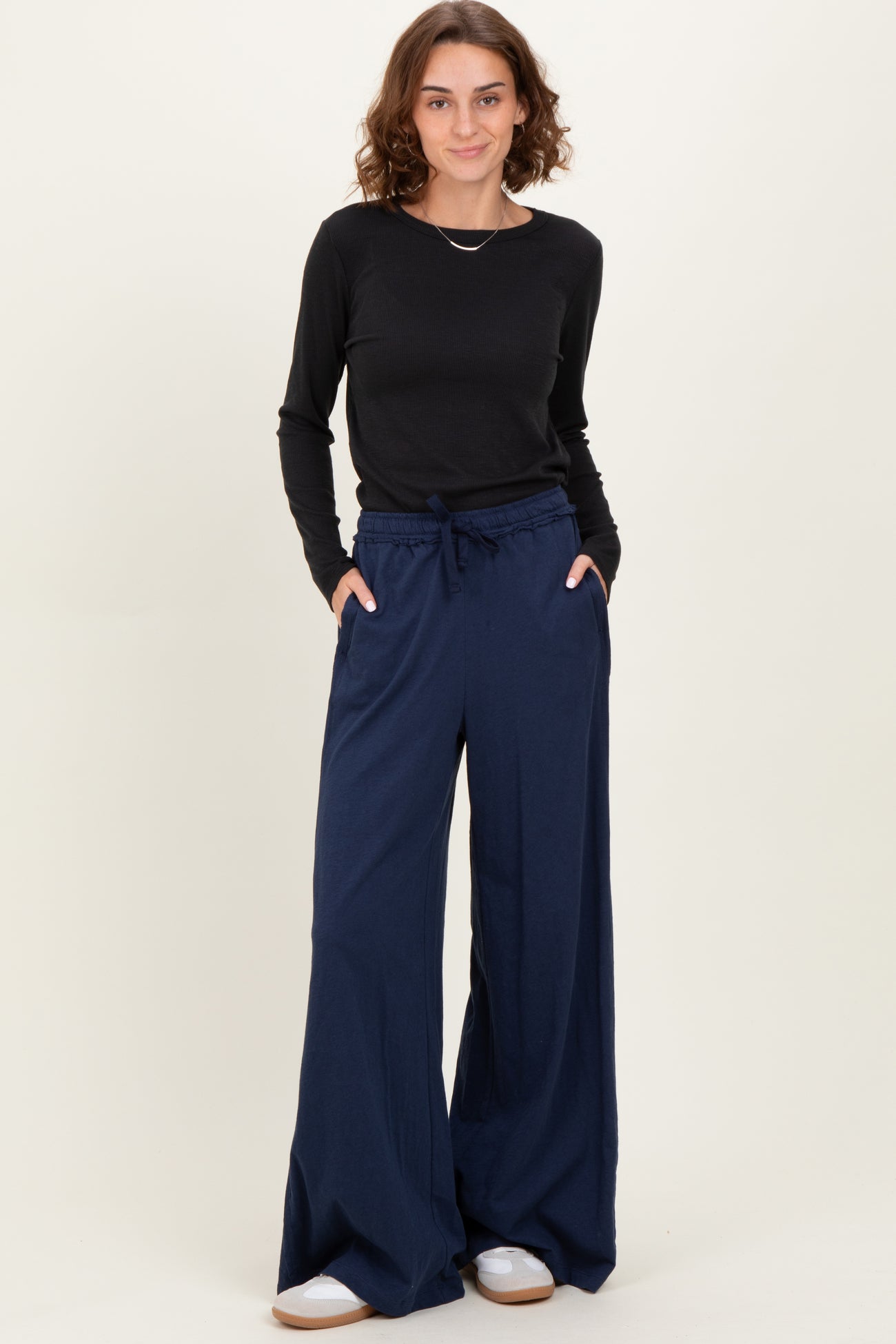 Experience ultimate comfort with our Navy Drawstring Wide Leg Lounge Pant. Crafted from soft, breathable fabric, these pants feature a relaxed wide-leg fit that flows effortlessly for a chic yet cozy look. The adjustable drawstring waist ensures a perfect fit, while convenient side pockets add practicality. Whether you’re lounging at home or running errands, these versatile navy pants combine style and ease with every step. Pair them with your favorite top and sneakers for a laid-back, fashion-forward outfit you’ll reach for again and again. Perfect for casual days or unwinding in style!