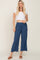 A pair of crop length, linen pants featuring an elastic waistband, side pockets, and fringe trim.