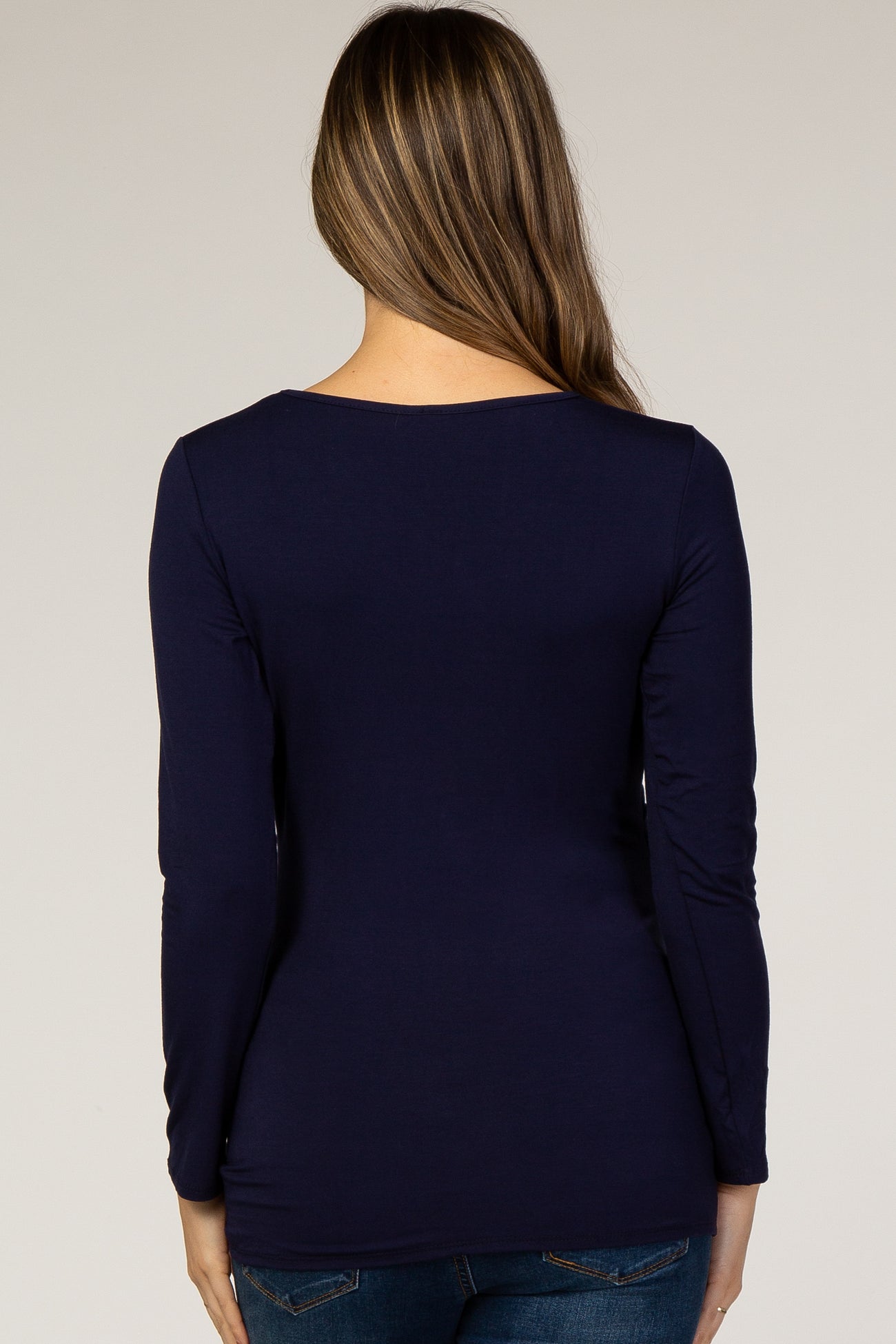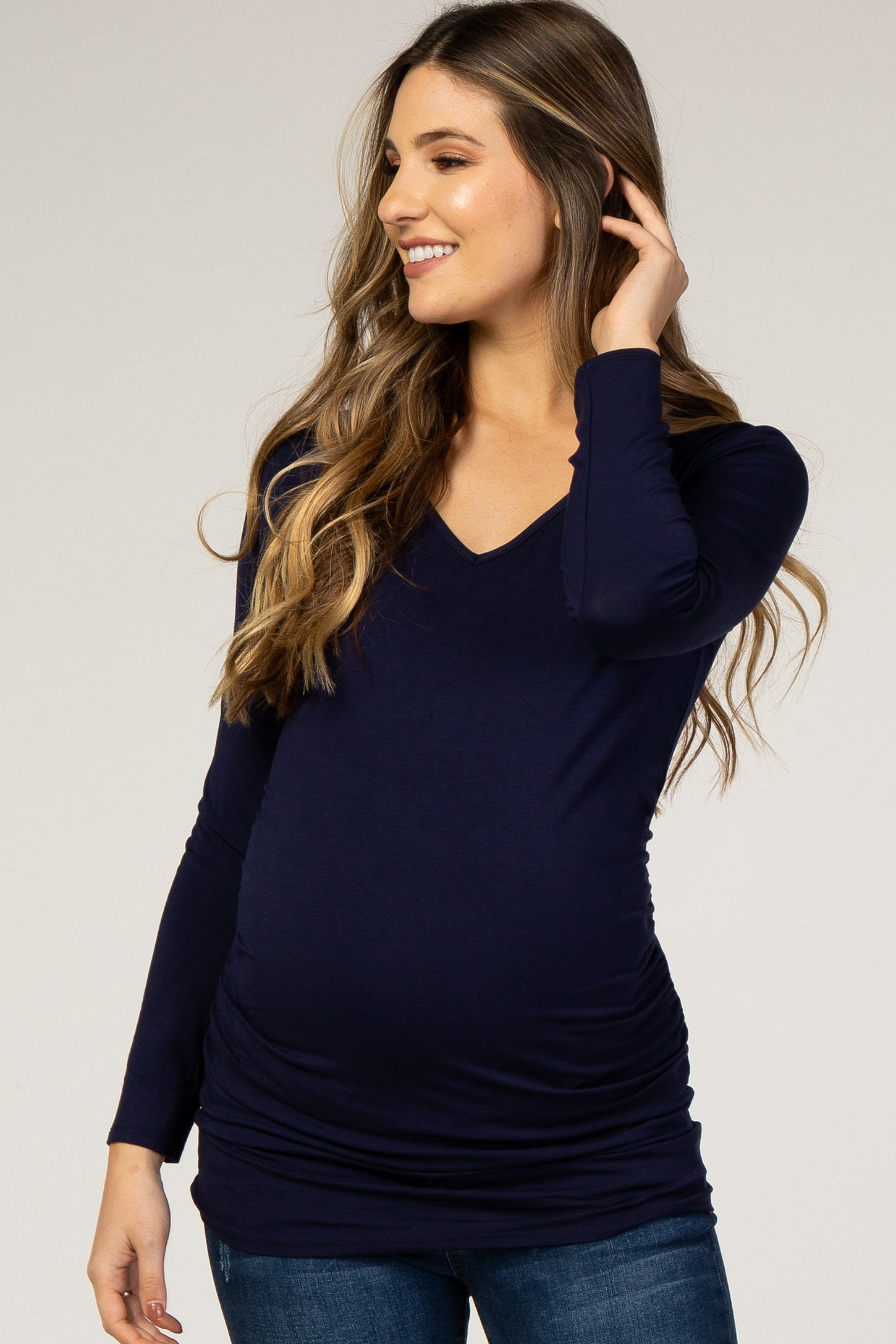 A solid hued fitted maternity top featuring long sleeves, side ruching and a v-neckline.
