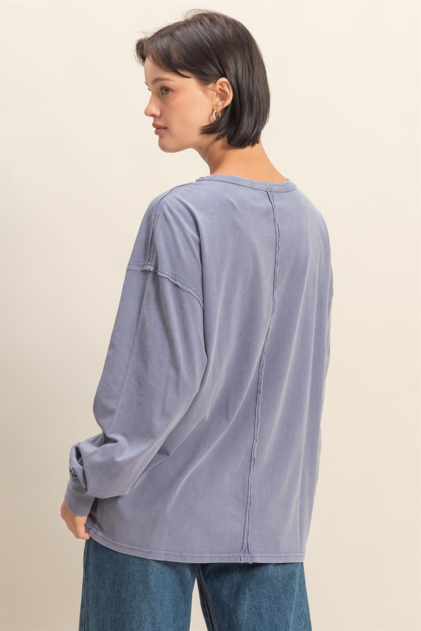 Navy Oversized Washed Long Sleeve Pocket Top