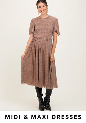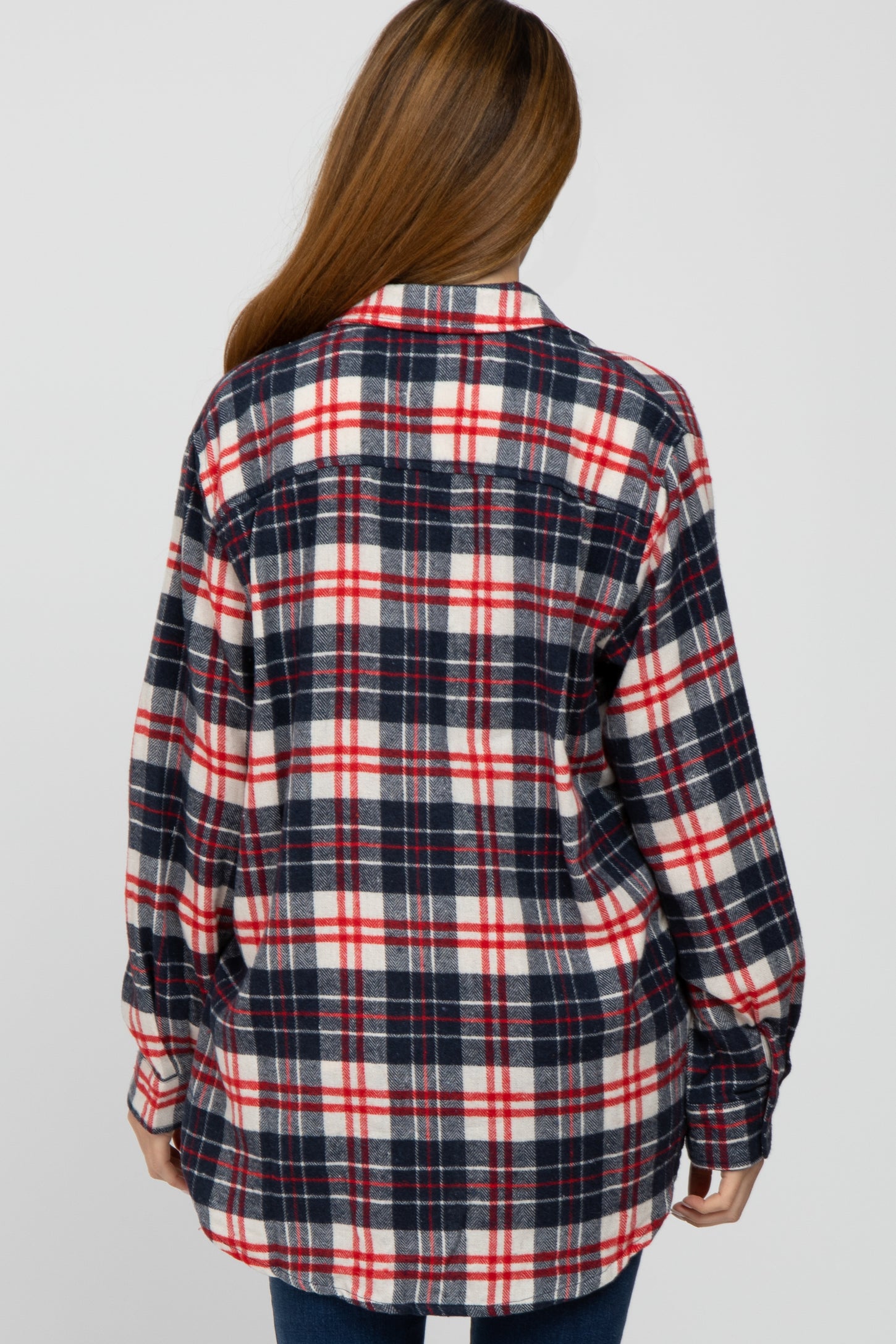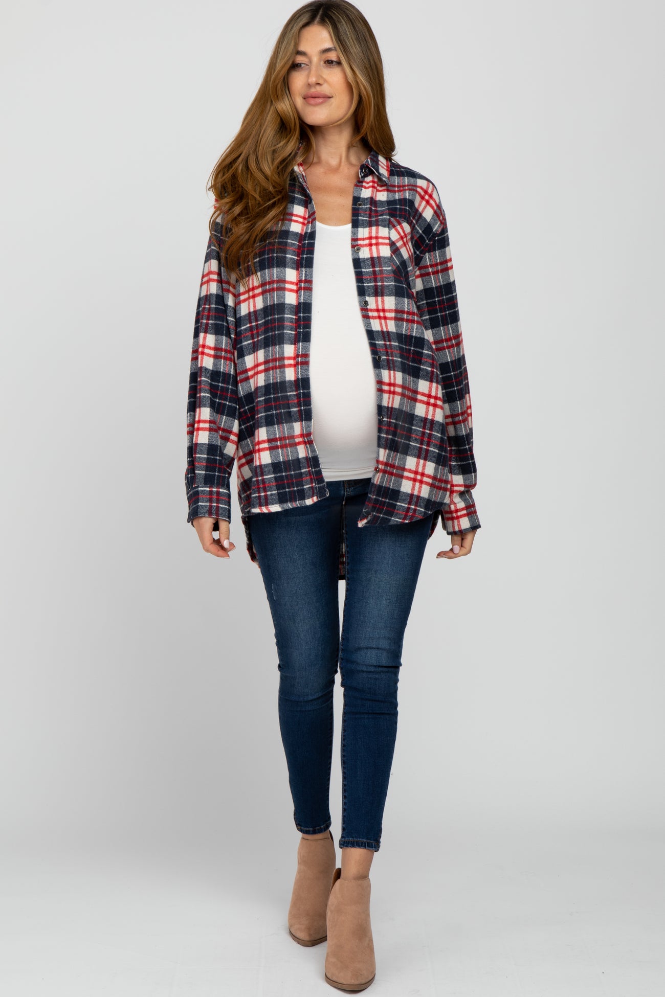 A soft plaid flannel maternity top featuring a collared neckline, long cuffed sleeves, front buttons, a hi-low hemline, and a front pocket.