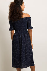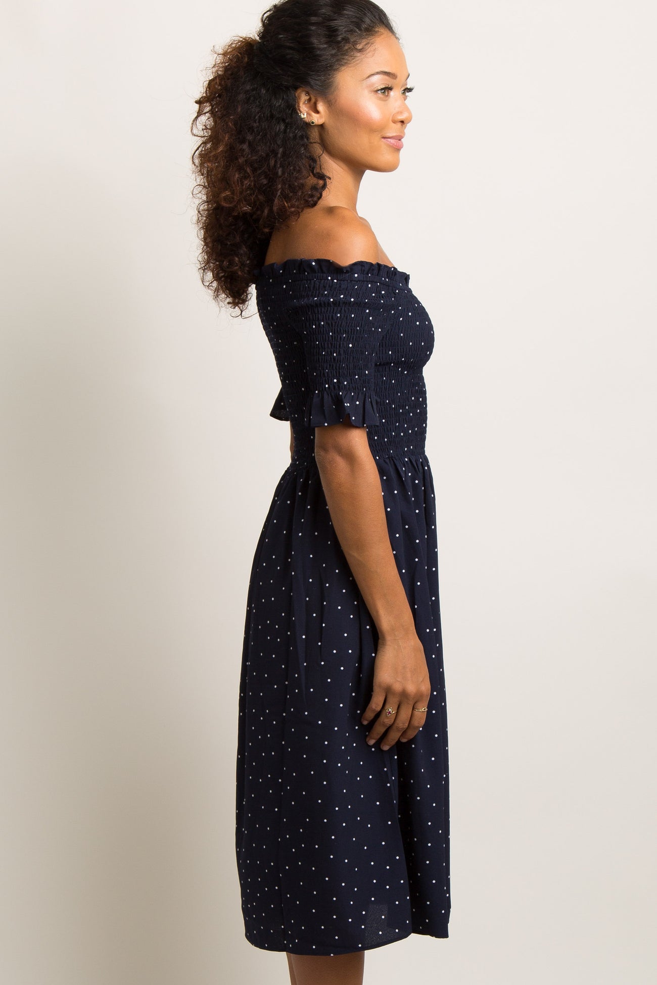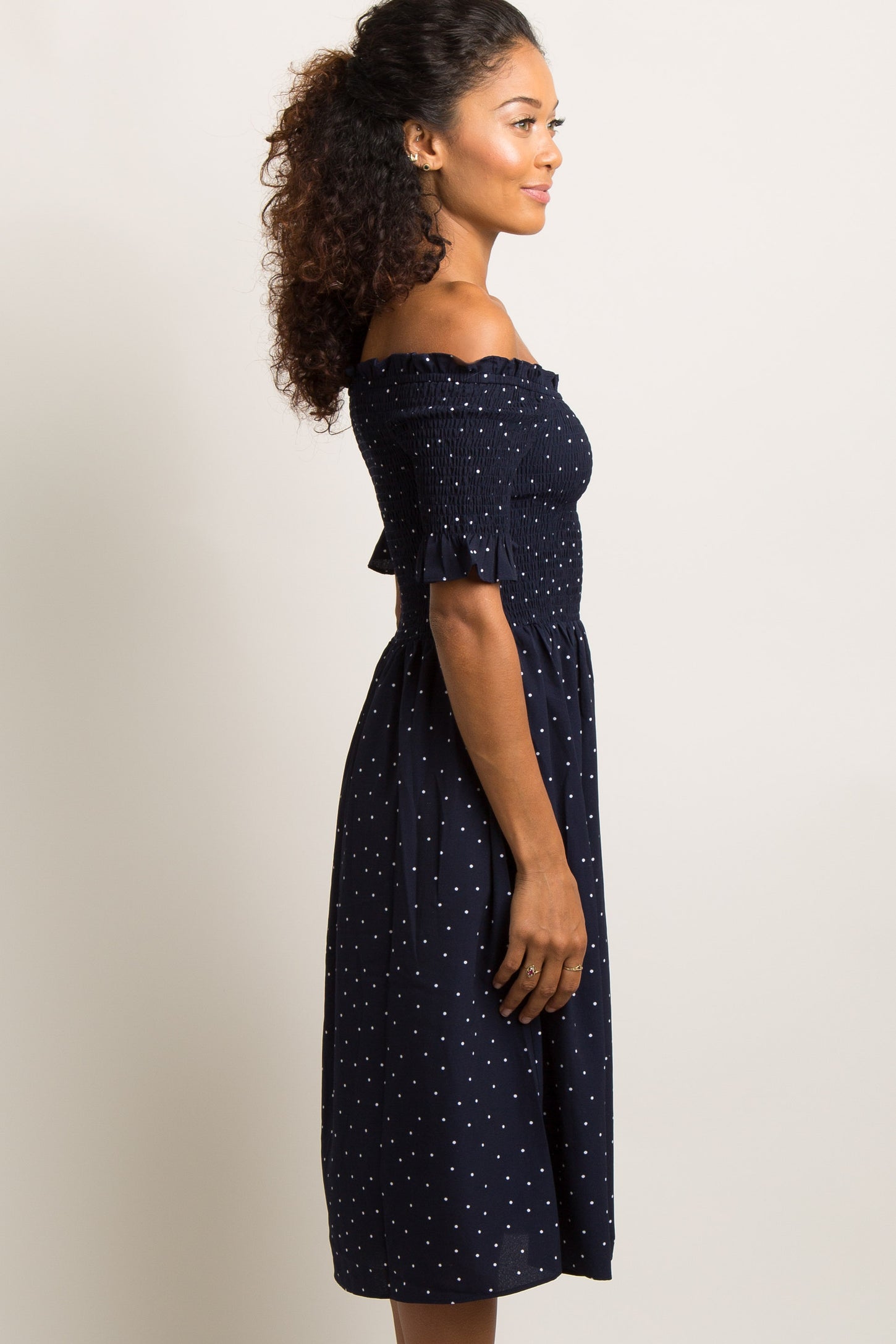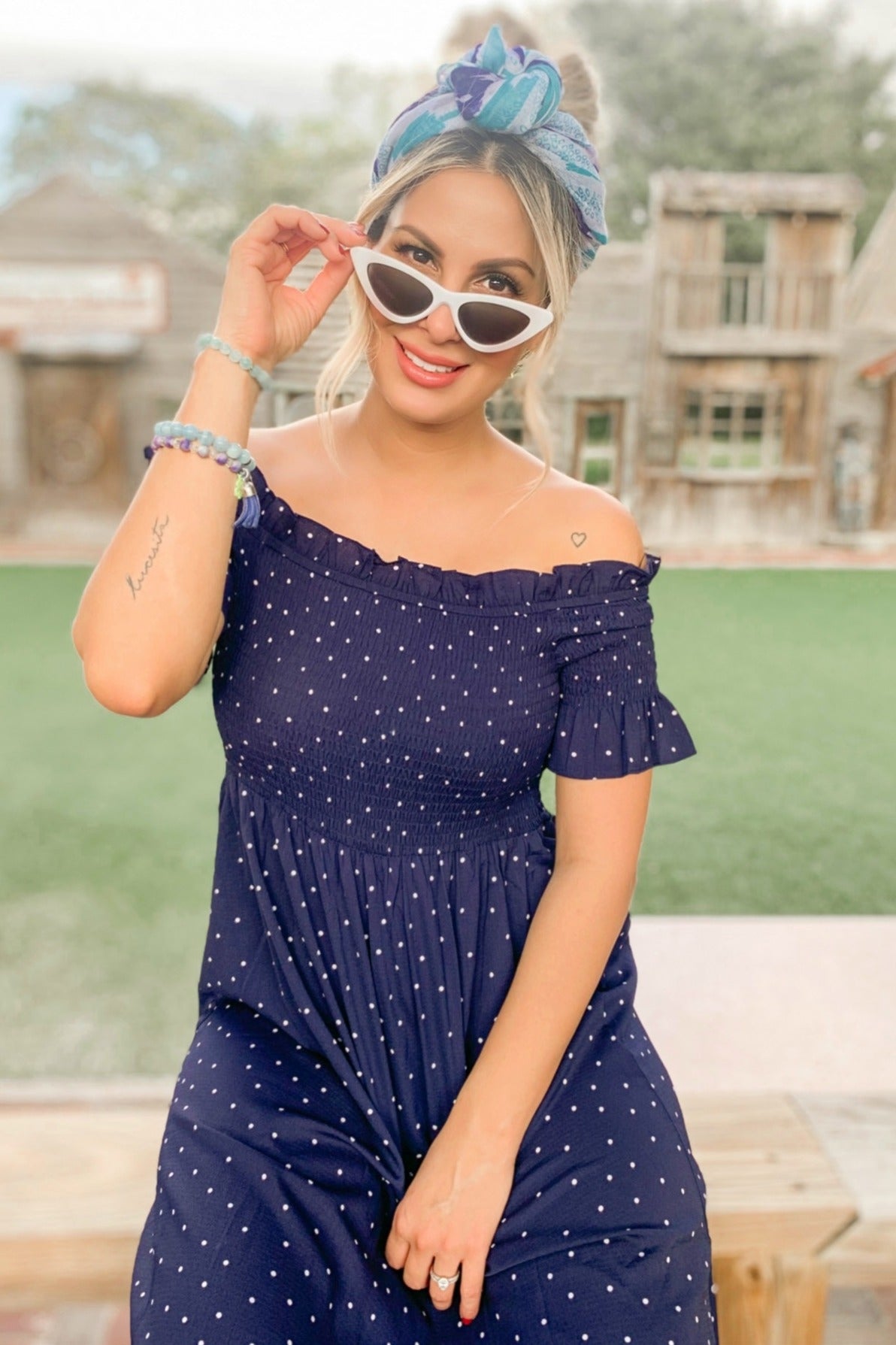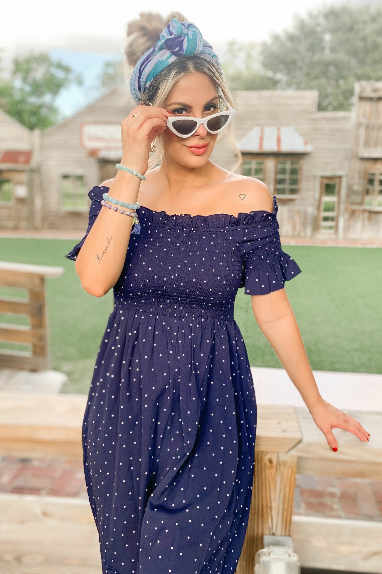 A polka dot print dress with smocked bust featuring short sleeves, an off shoulder neckline, and a slight ruffle trim.