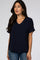 A solid hued blouse featuring short sleeves and a v-neckline.