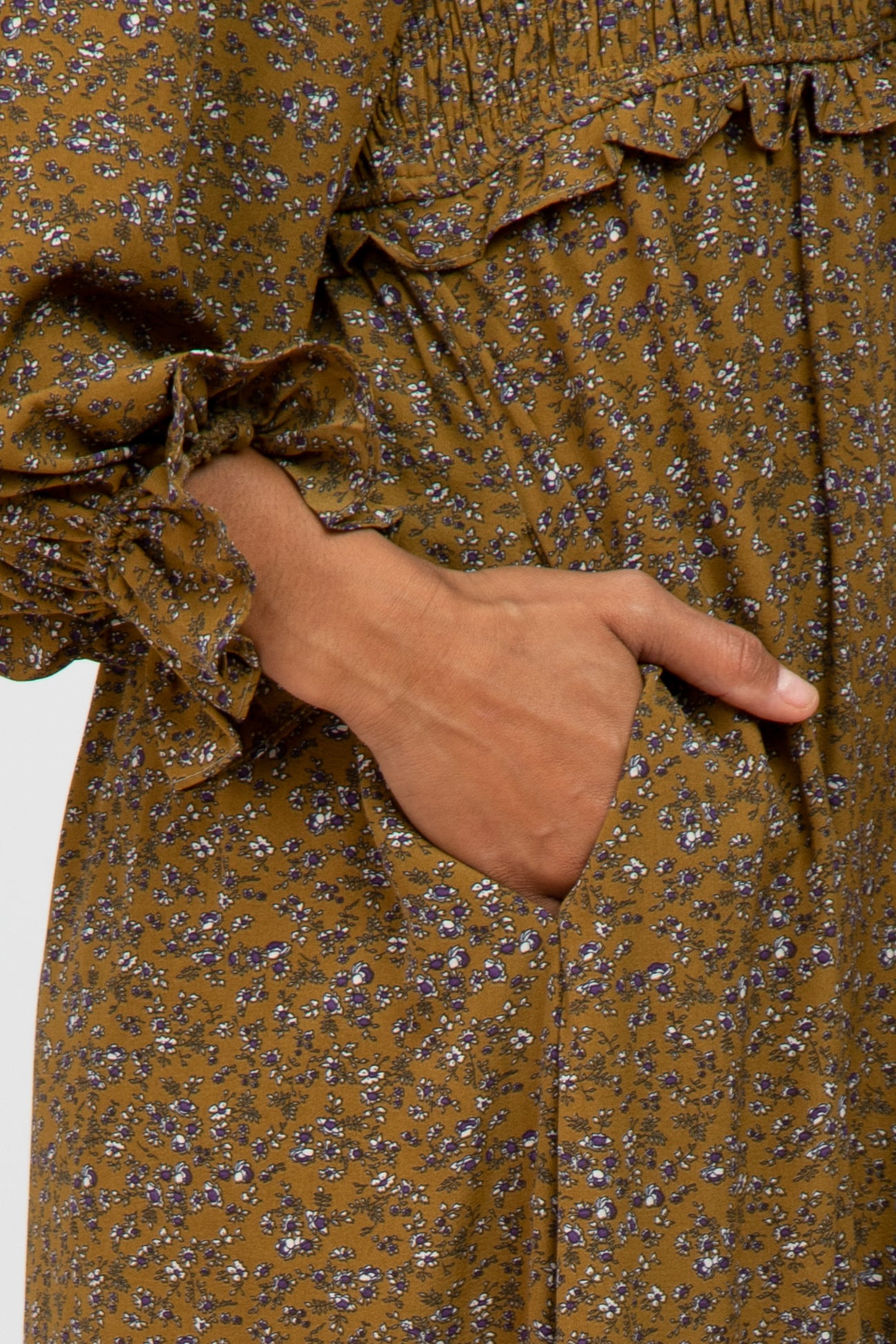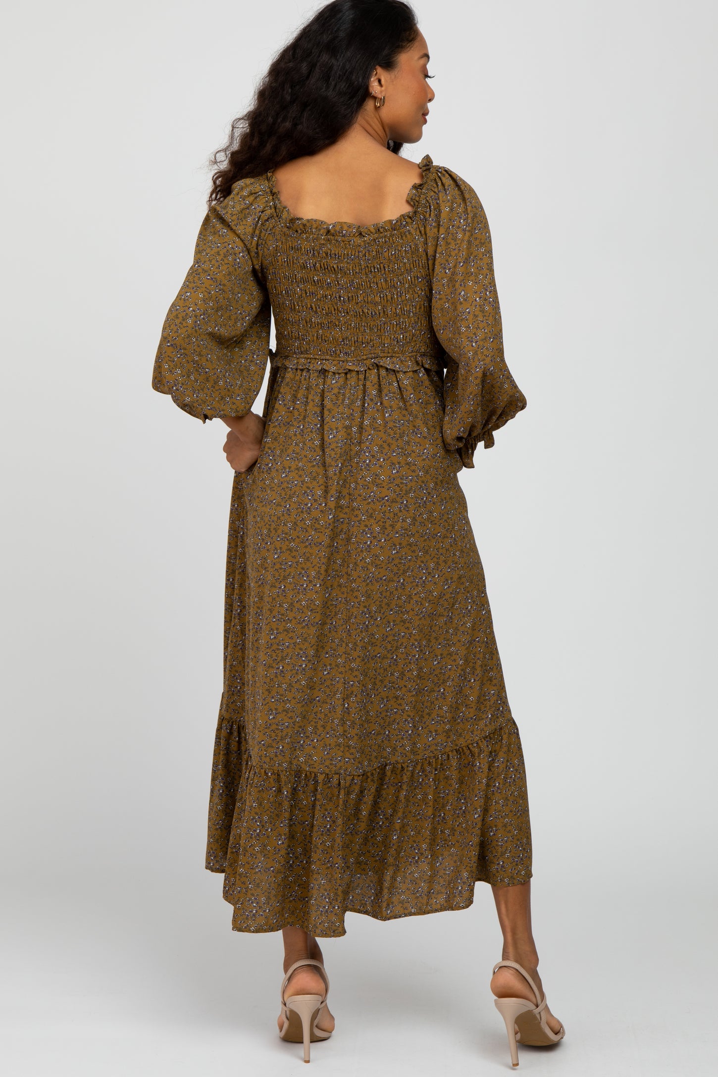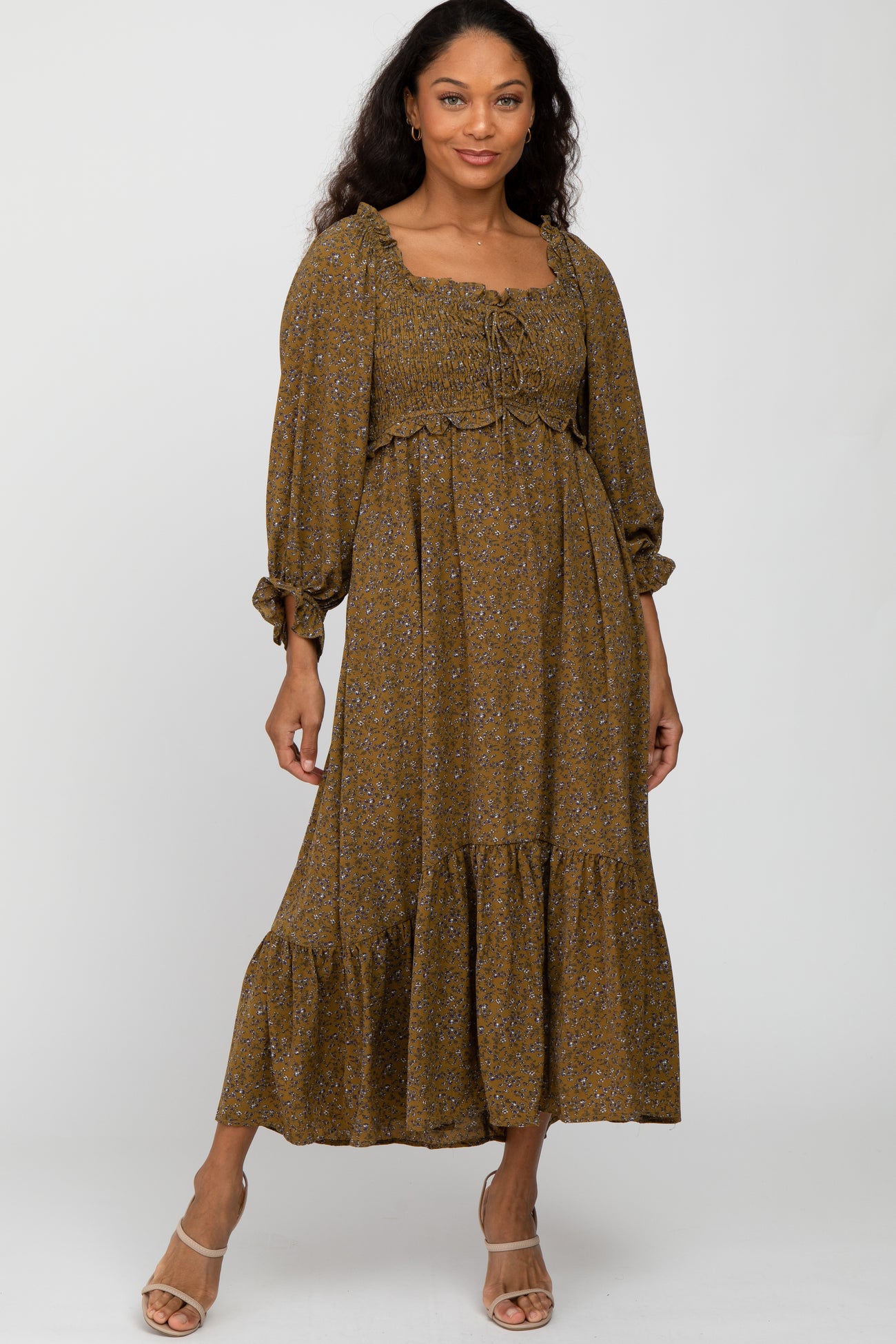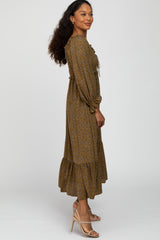 Olive Floral Ruffle Sweetheart Neck Midi Dress