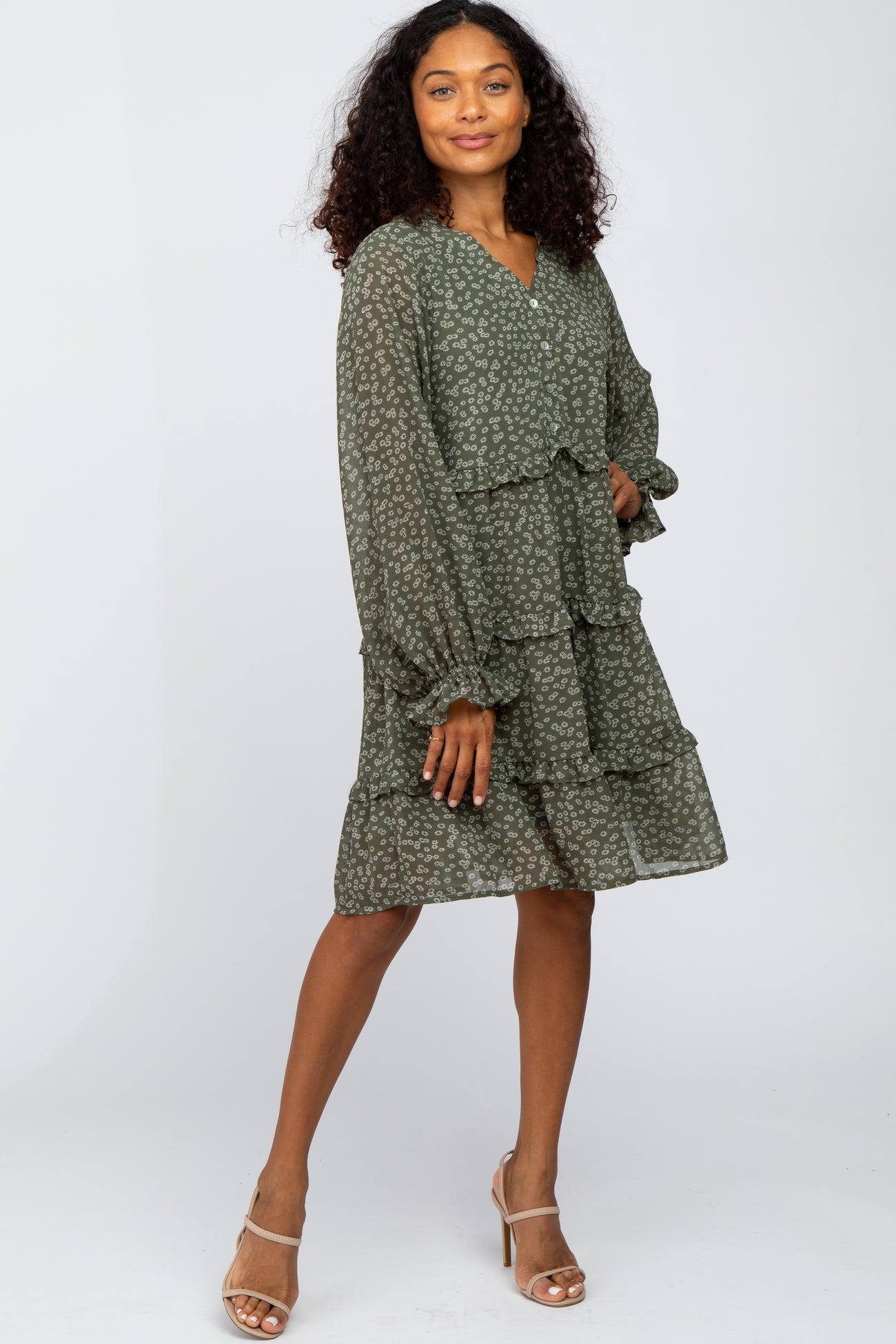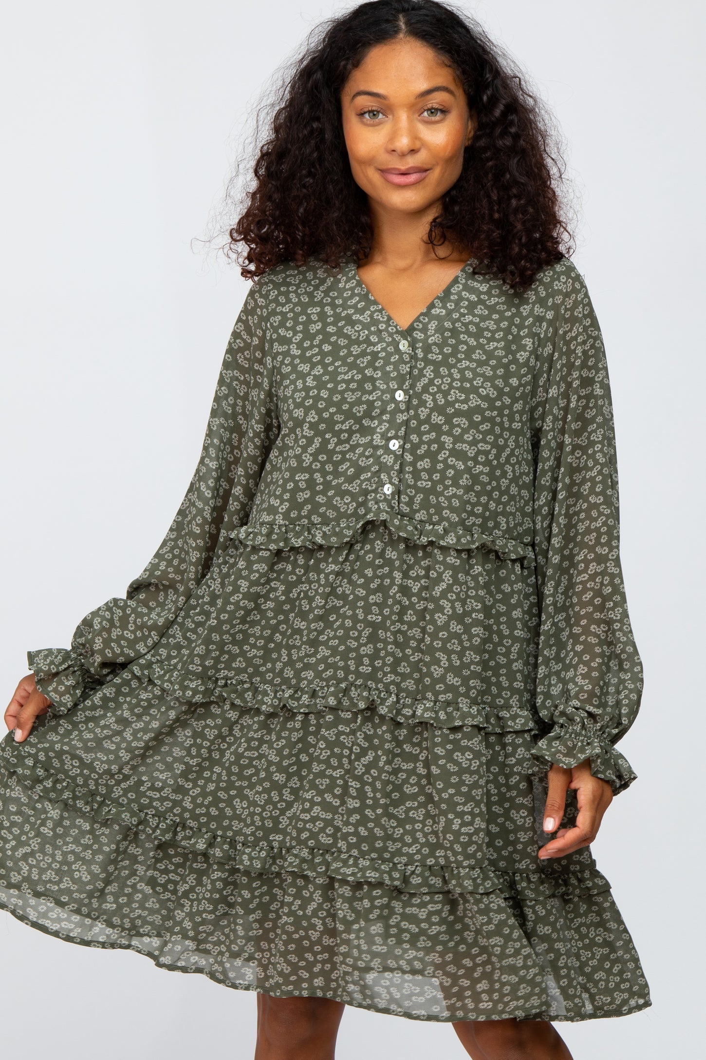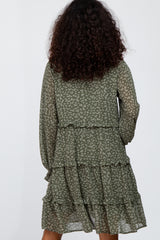 Olive Floral Tiered Ruffle Accent Dress