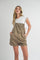 A solid hue short overall featuring adjustable strap ties, a front pocket, side pockets, and a cuffed hem.