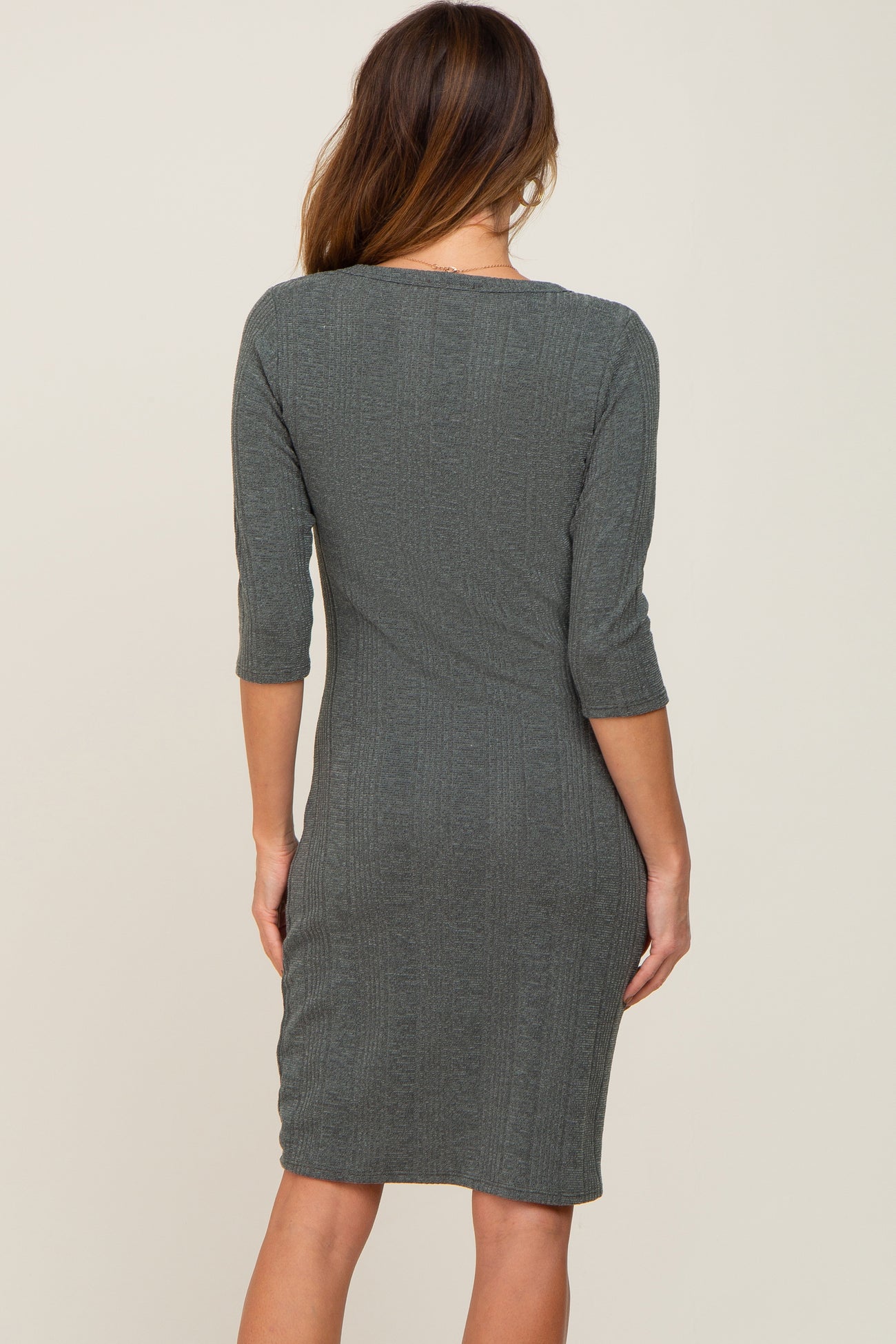 A rib knit dress with a rounded neckline and 3/4 length sleeves.