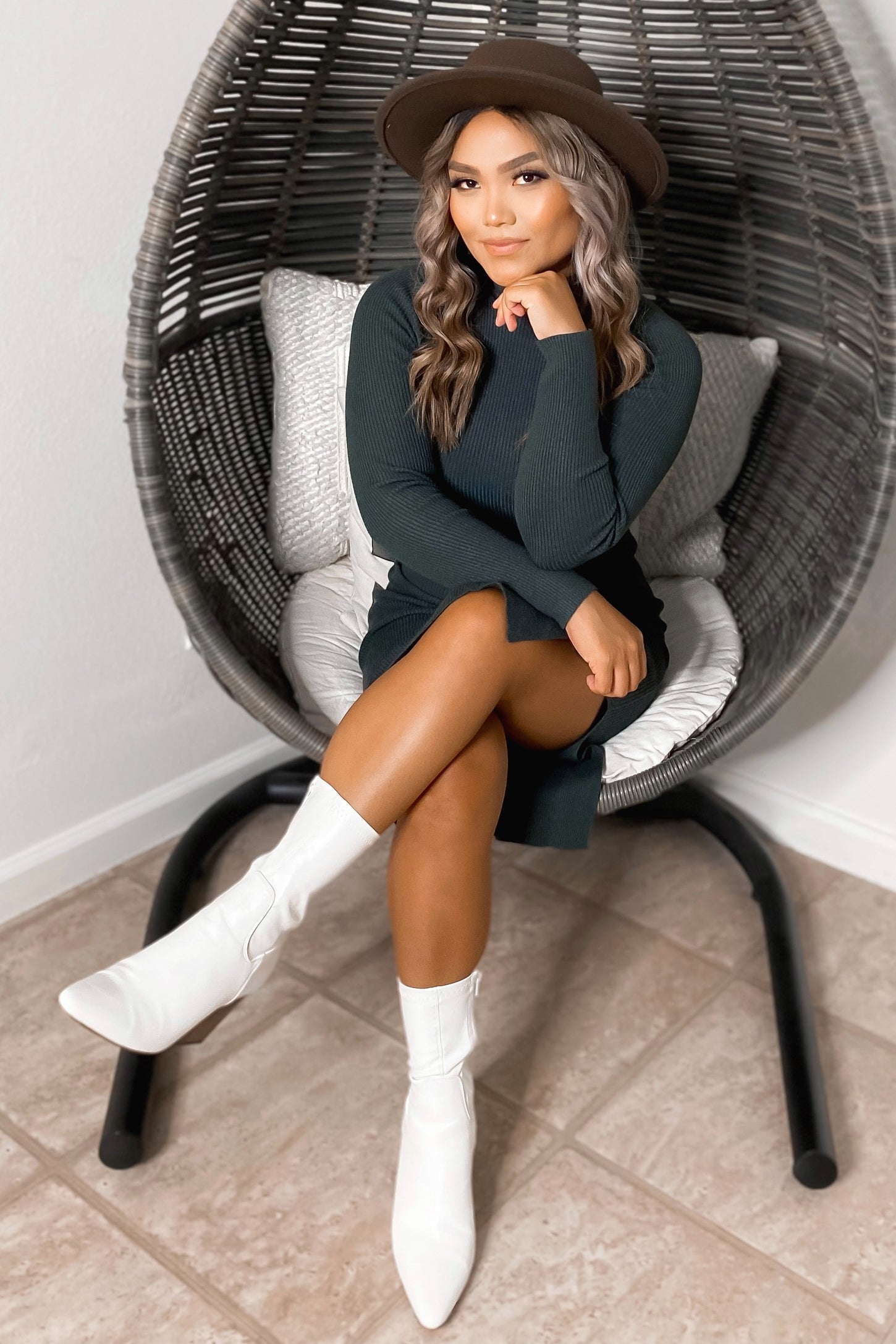 Olive RIbbed Fitted Mock Neck Long Sleeve Midi Dress
