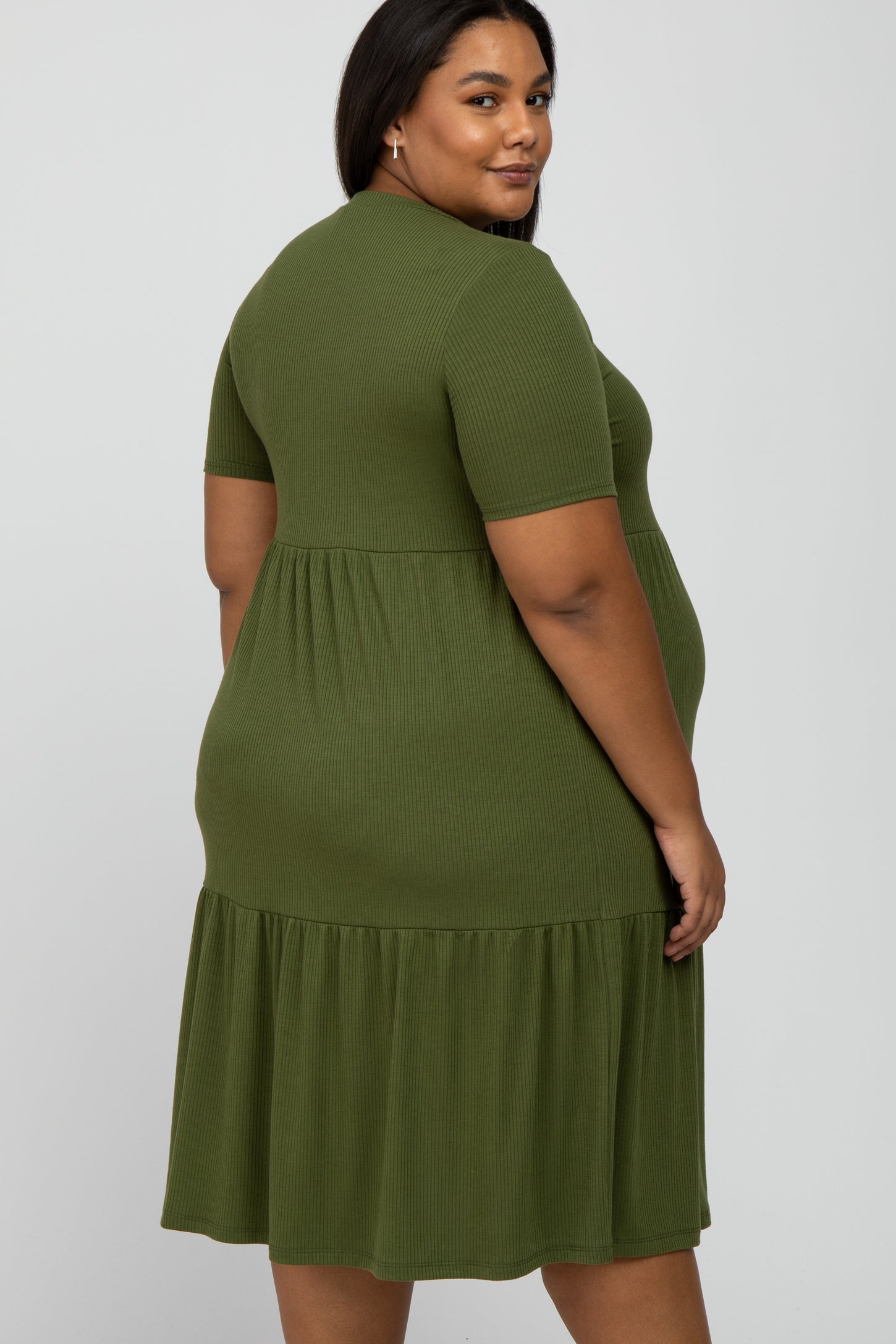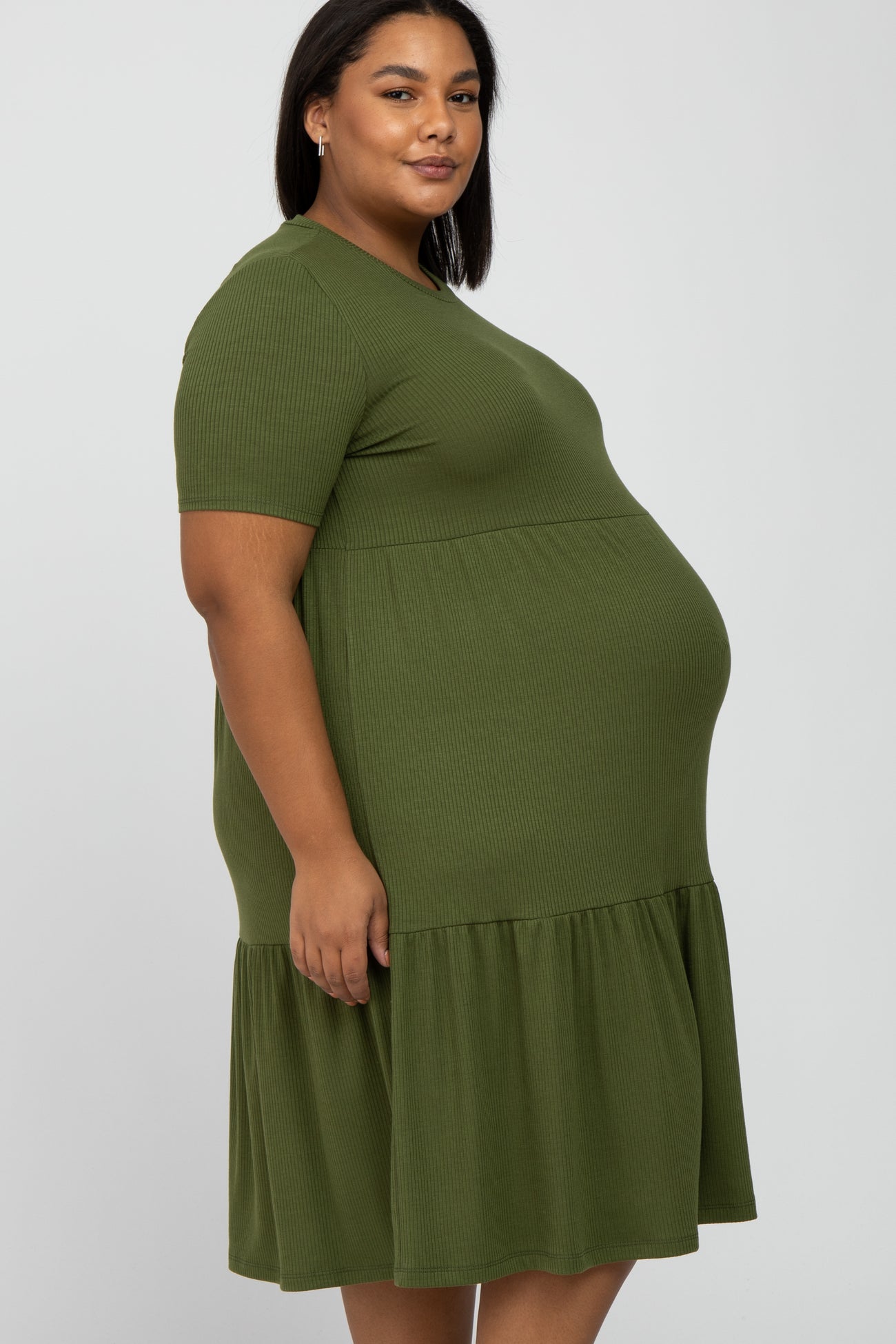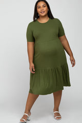 Olive Ribbed Tiered Maternity Plus Dress