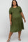 A solid ribbed short sleeve maternity plus dress with scoop neckline and tiered body.