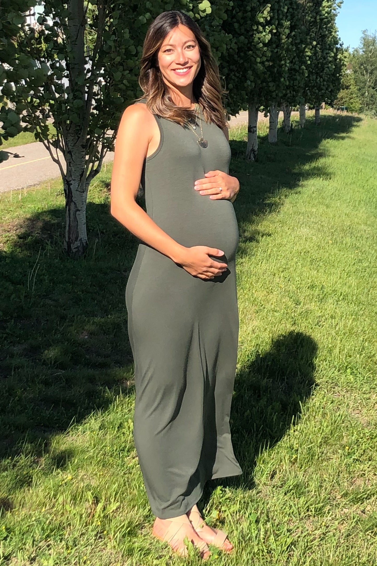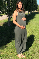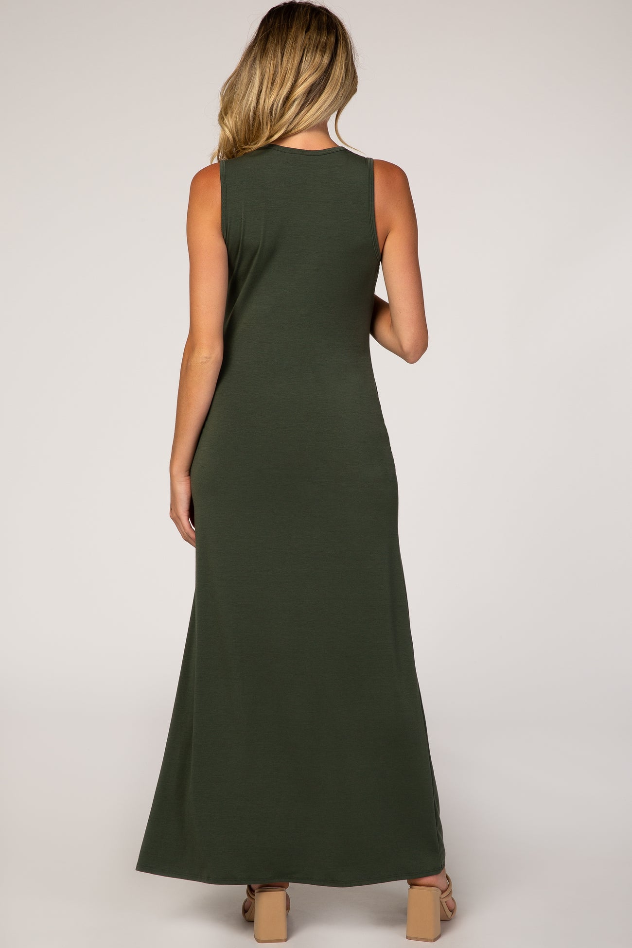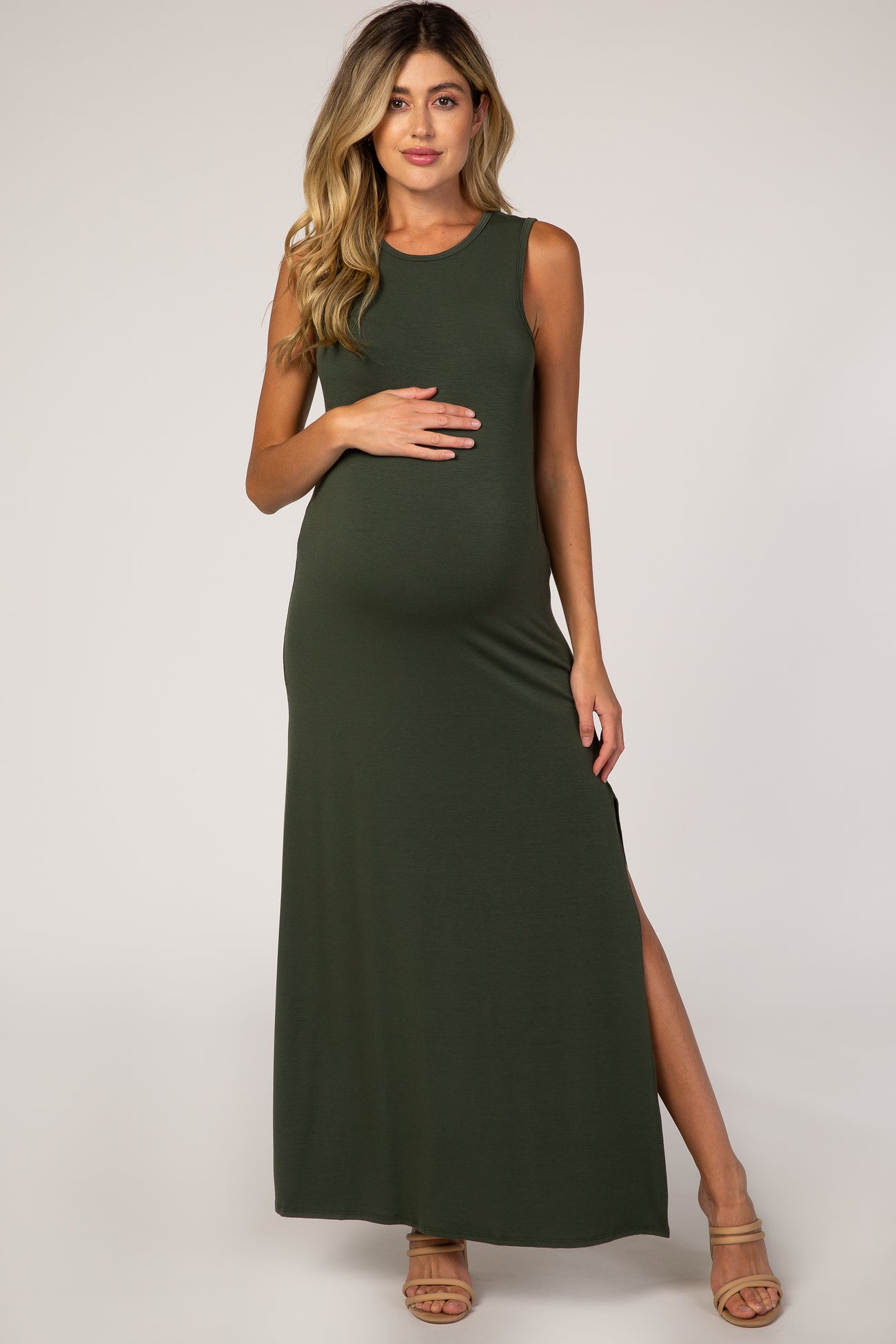 A basic maxi dress with a rounded neckline and a side slit detail.