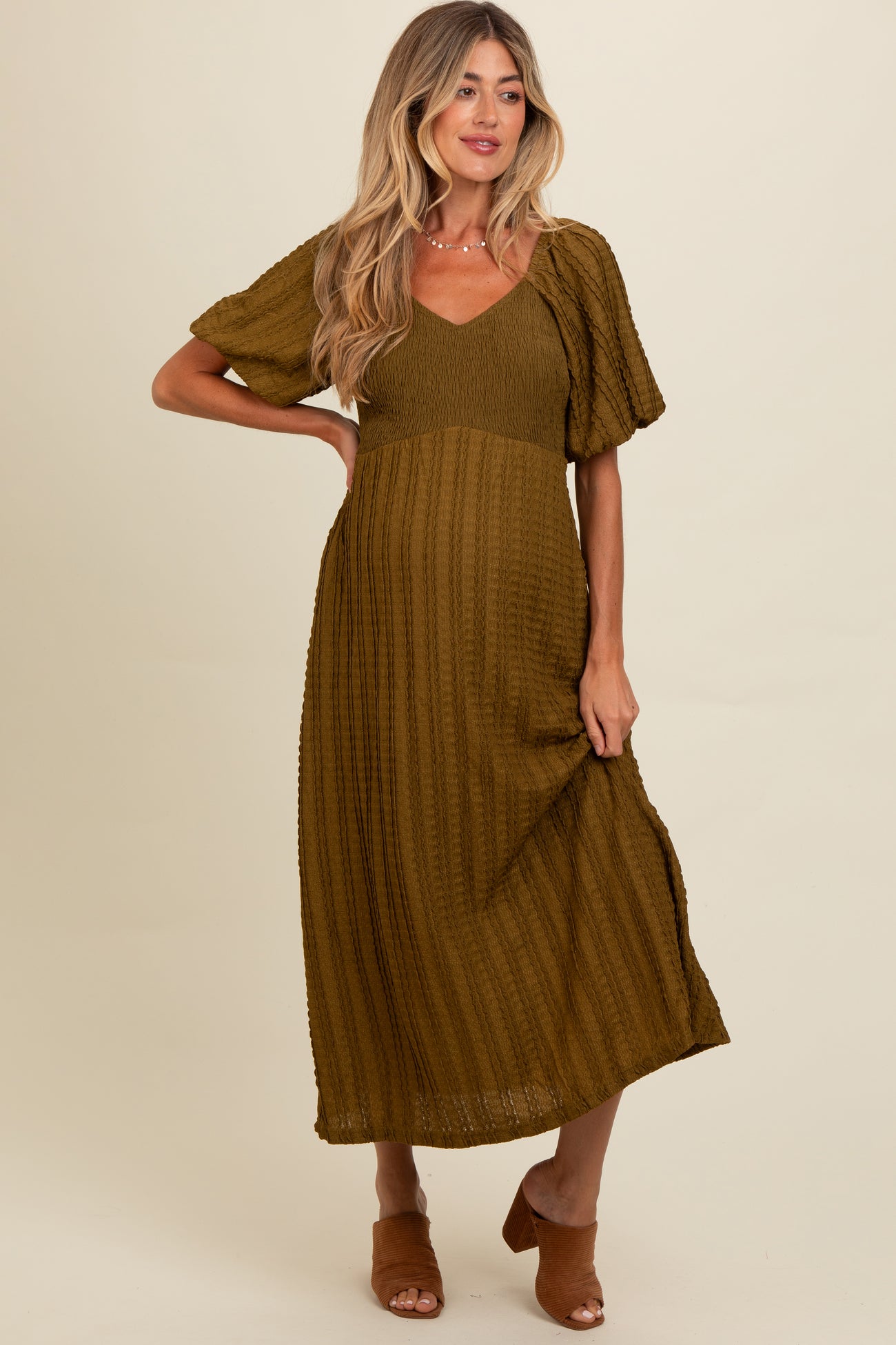 Olive Smocked V-Neck Short Puff Sleeve Textured Maternity Midi Dress
