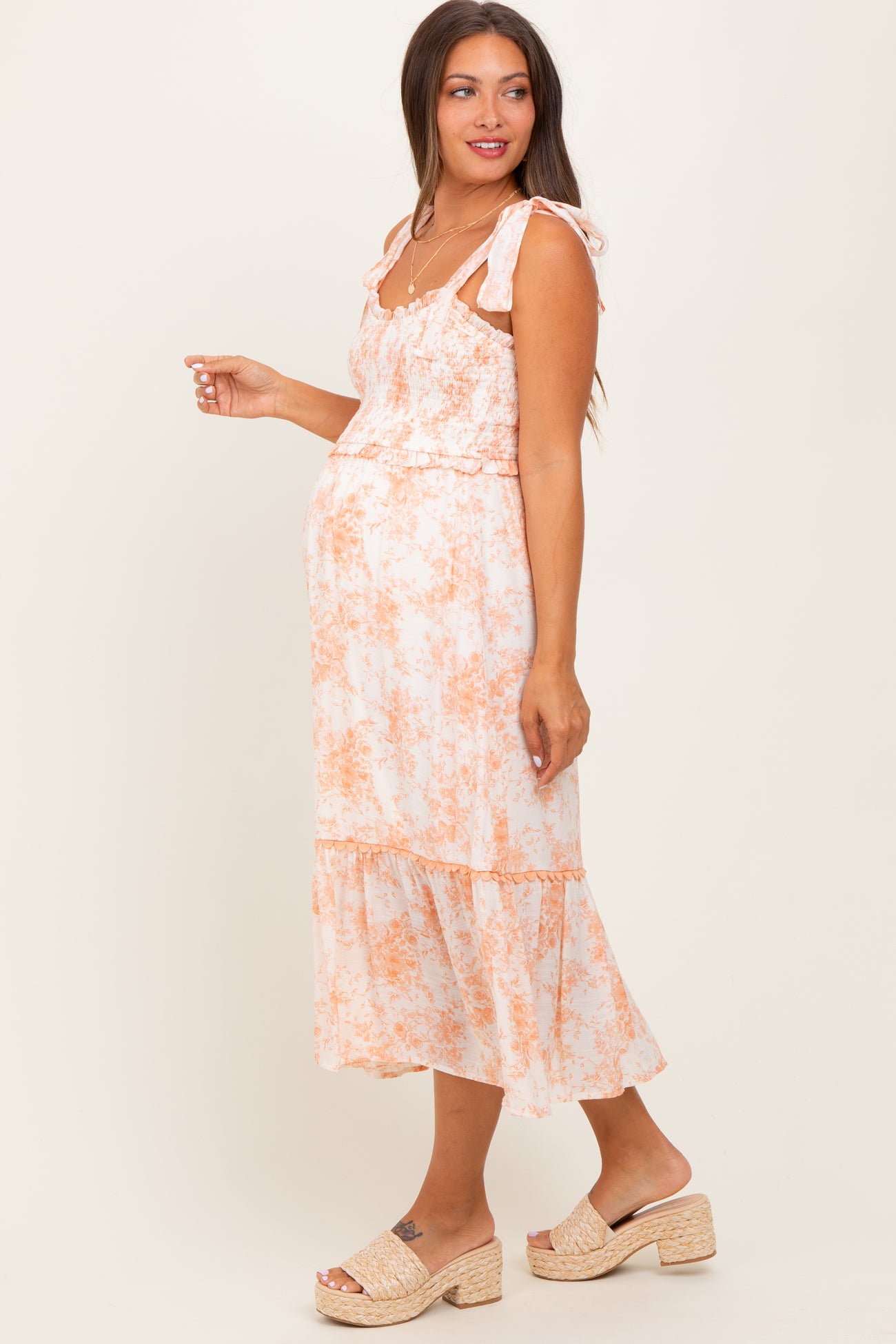 Peach Floral Smocked Shoulder Tie Maternity Midi Dress