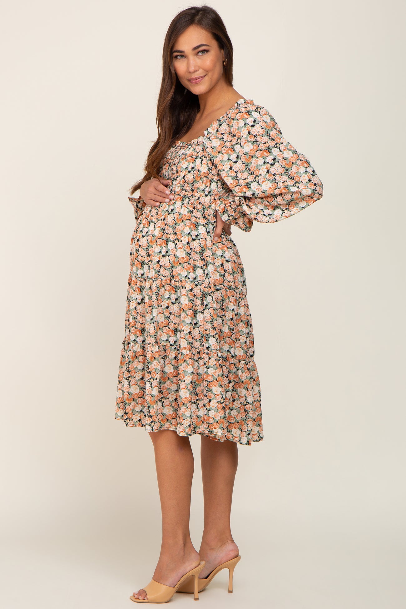 A floral maternity dress featuring a square neckline, a smocked elastic top, long puff sleeves, side pockets and a tiered skirt with a ruffle hem.