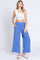 A pair of crop length, linen pants featuring an elastic waistband, side pockets, and fringe trim.