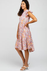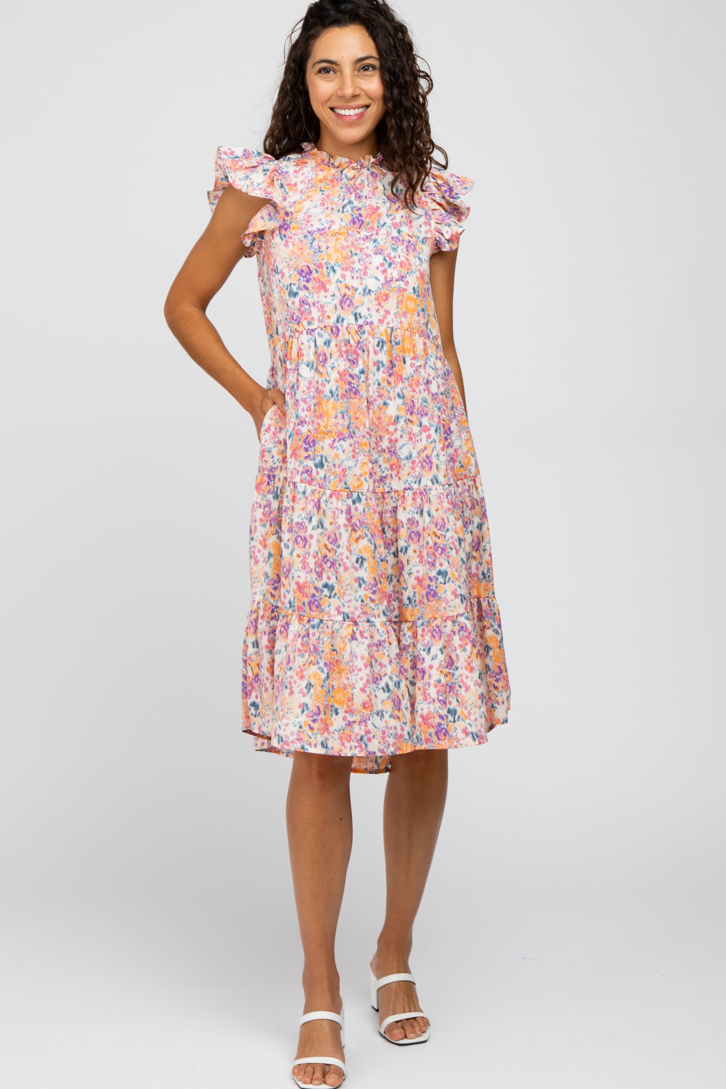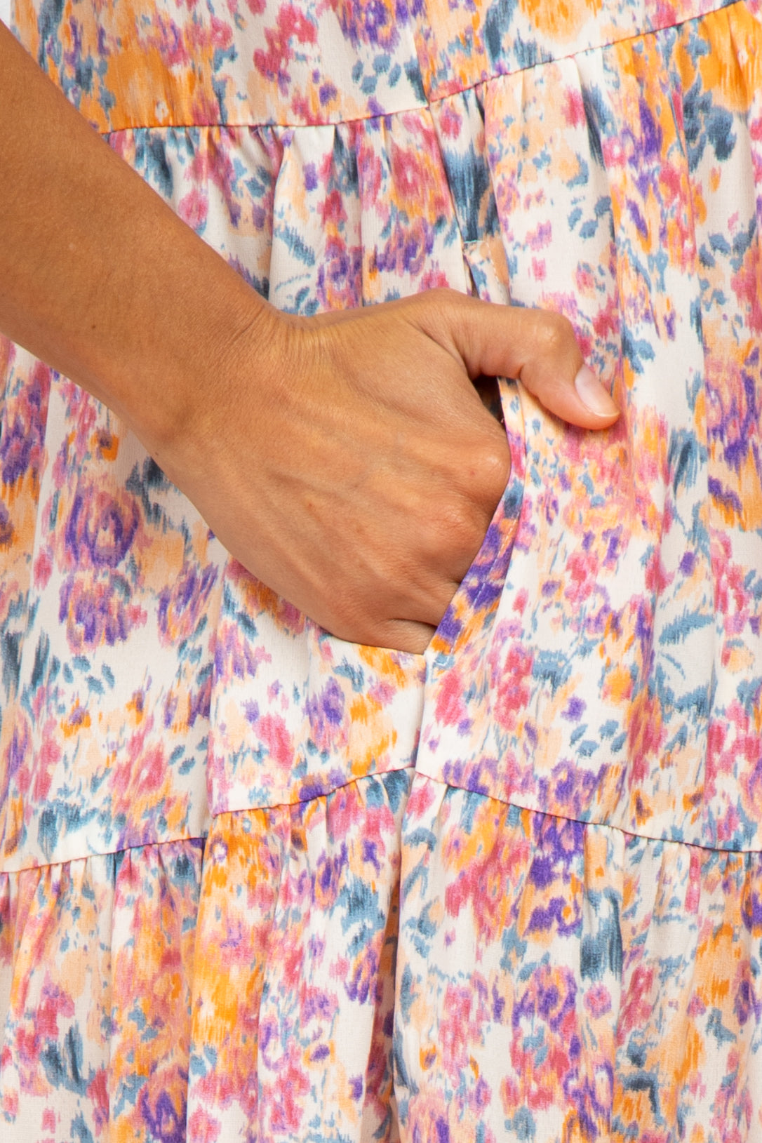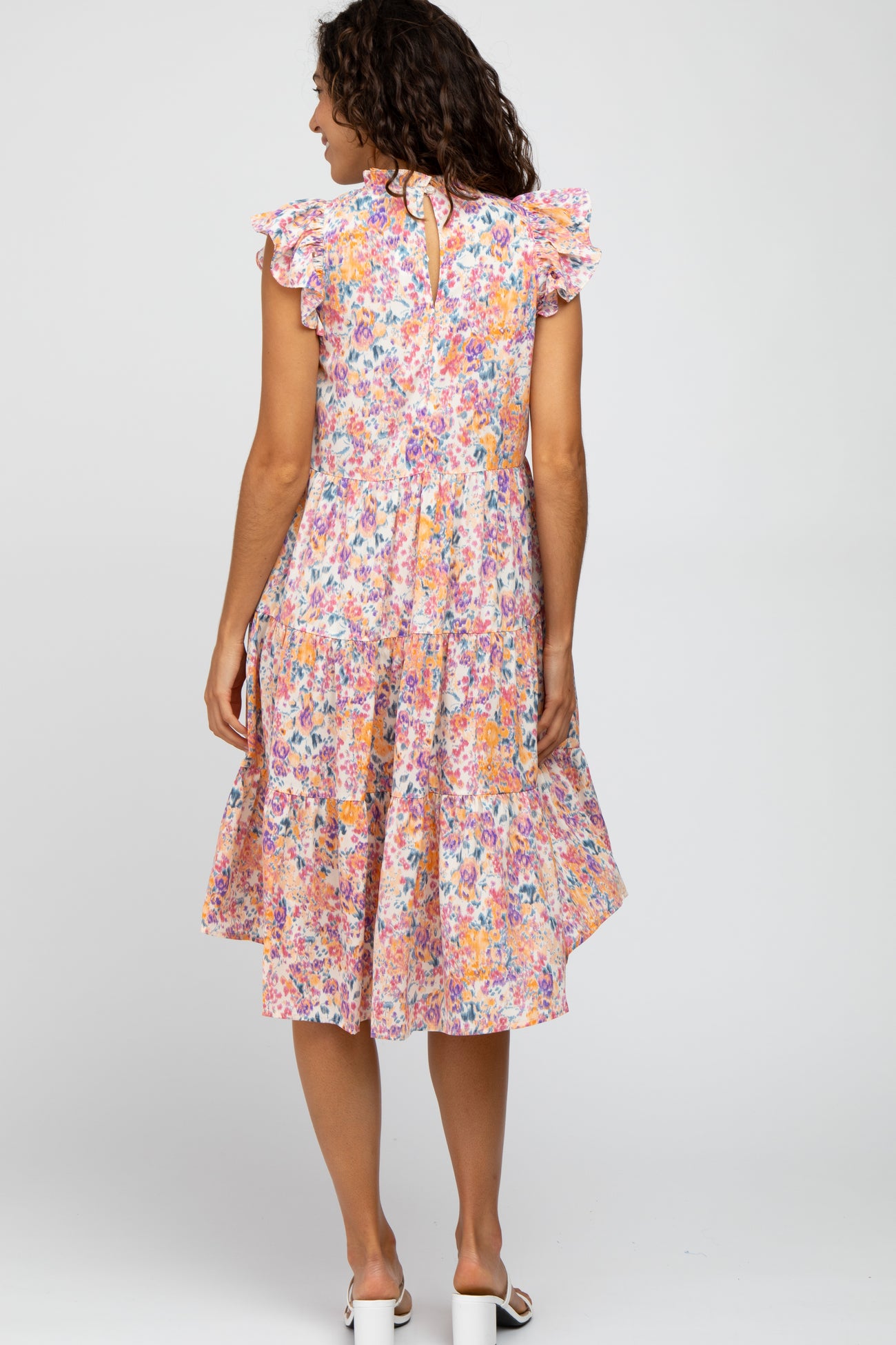 Details A printed midi dress. Features ruffle mock neckline, ruffle trim cap sleeves, and keyhole opening with button closure at back. Content + Care