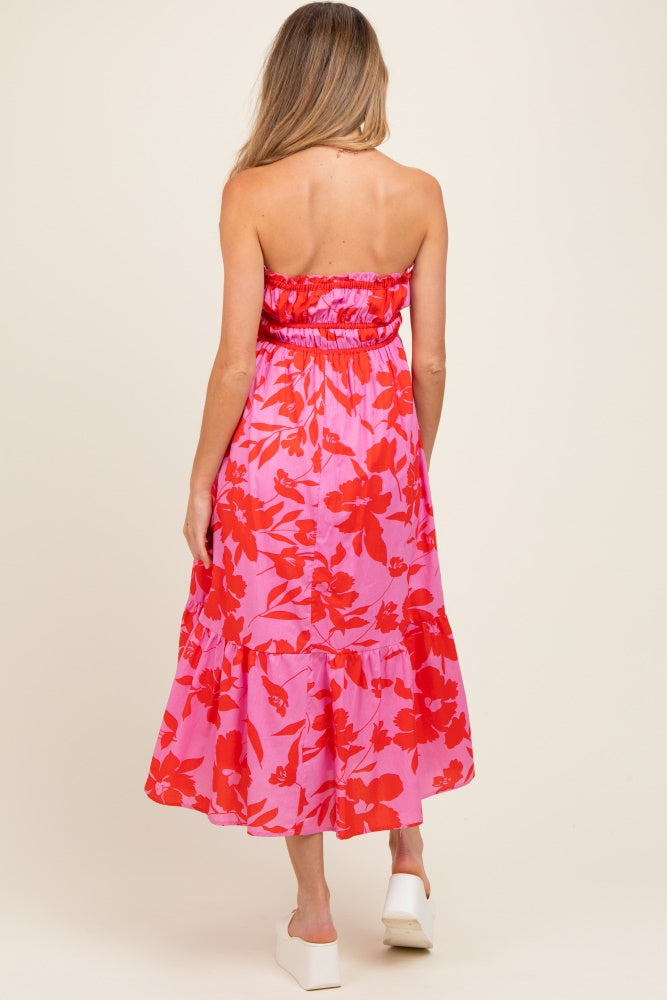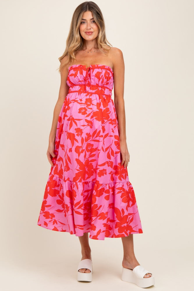 Pink Floral Strapless Front Tie Maternity Midi Dress