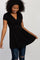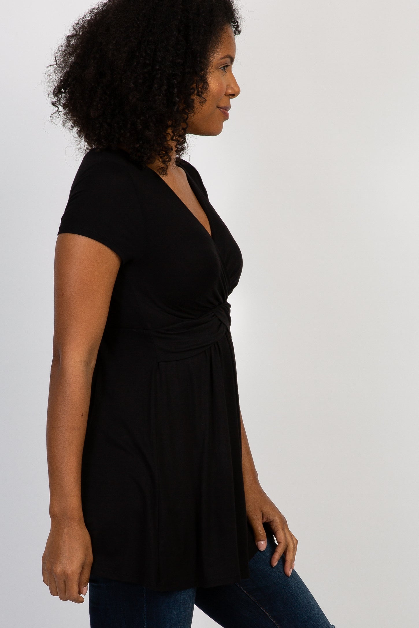 A draped front top featuring a v-neckline, short sleeves, and cinching under bust.