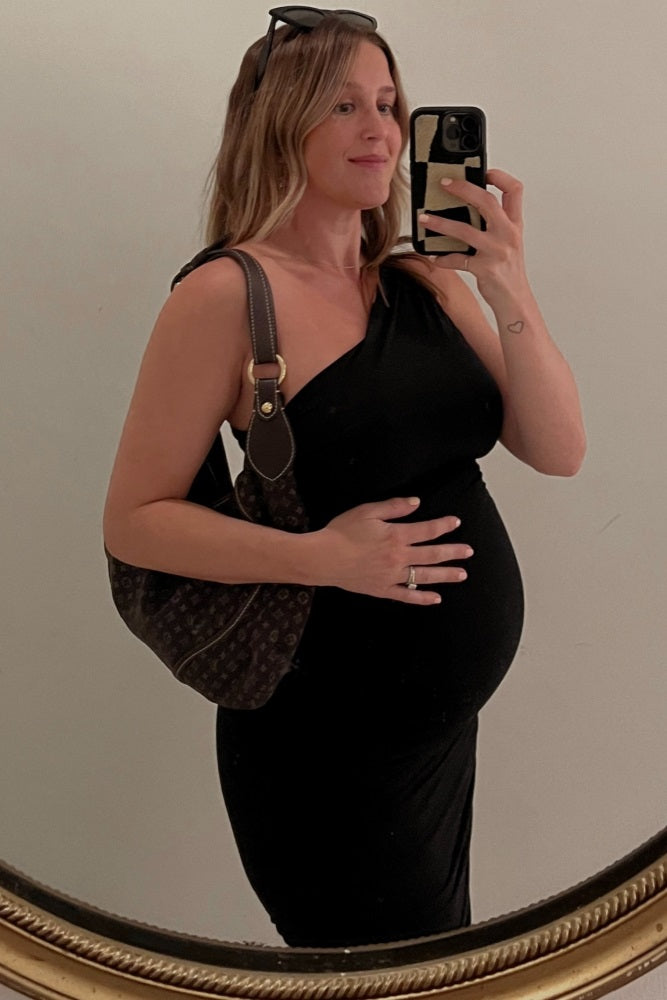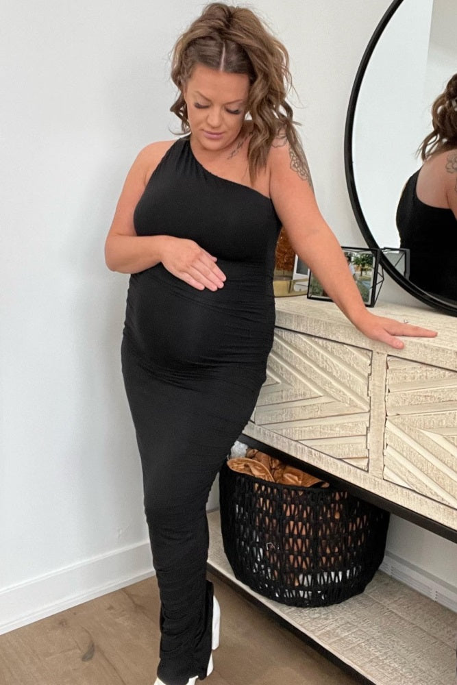 Make a statement at every event with our Ruched One Shoulder Maternity Dress. Featuring a flattering one shoulder neckline and figure-hugging ruched detail, this dress is designed to accentuate your bump beautifully throughout every stage of pregnancy. Soft, stretchy fabric ensures all-day comfort, while the elegant midi length is perfect for both casual gatherings and special occasions. Dress it up with your favorite heels and accessories for a chic, sophisticated maternity look that’s as stylish as it is comfortable. A must-have for your mom-to-be wardrobe!