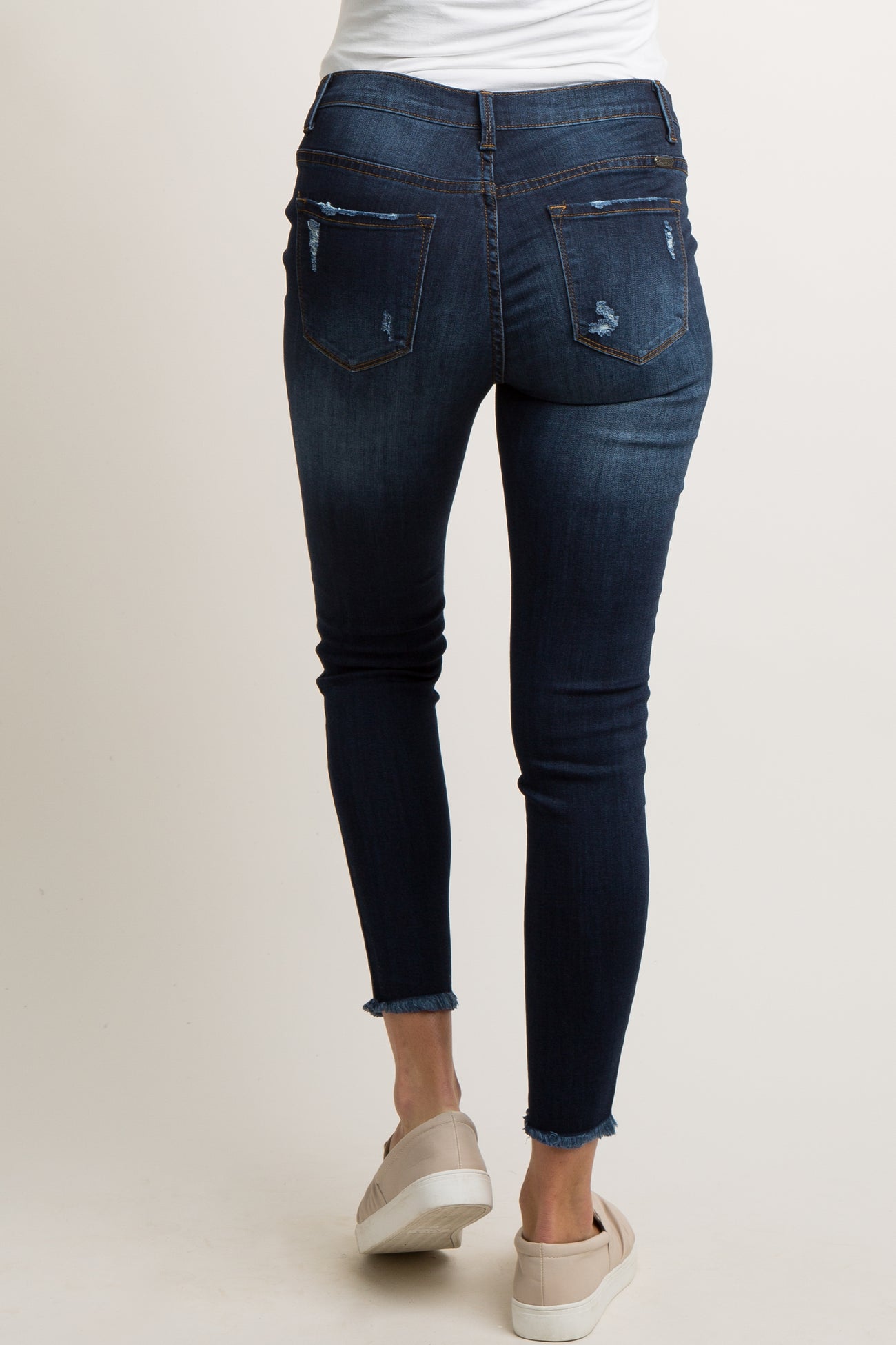 Experience effortless style and comfort in these PinkBlush Blue Dark Wash Slightly Distressed Skinny Jeans. Designed with a flattering skinny fit and subtle distressing, these jeans add a cool, modern edge to your maternity wardrobe. The stretchy, soft denim and full over-belly panel gently support your growing bump, ensuring a secure yet flexible fit all day long. Whether you're running errands or grabbing lunch with friends, these versatile jeans pair perfectly with your favorite tops and sneakers. Stay chic and comfortable throughout your pregnancy with this essential denim staple!