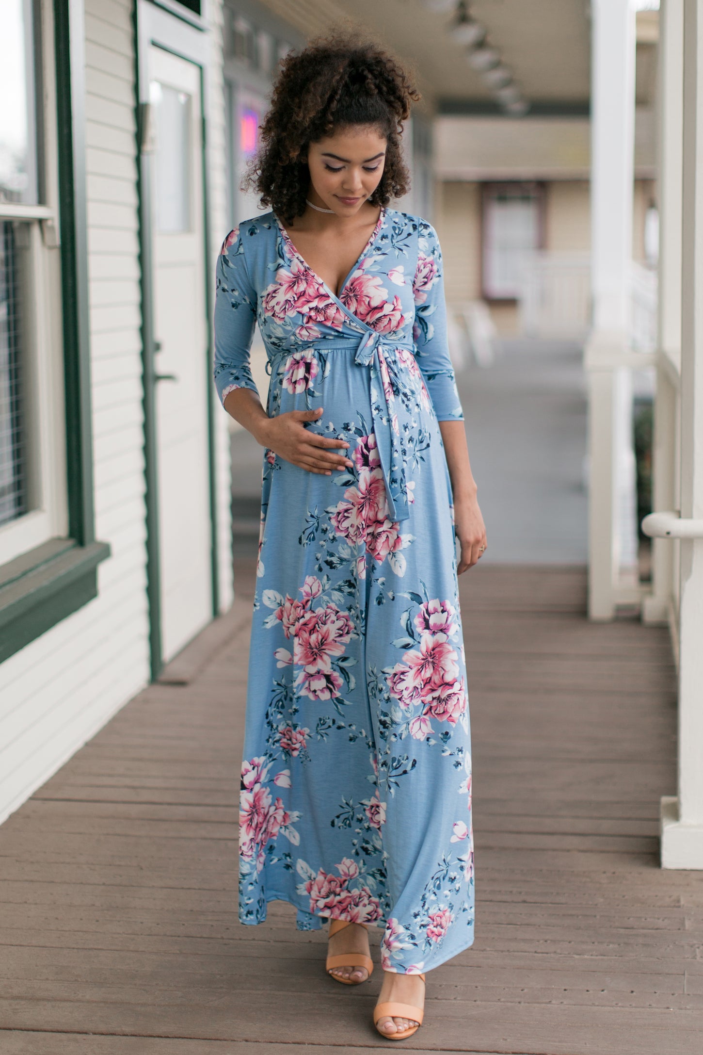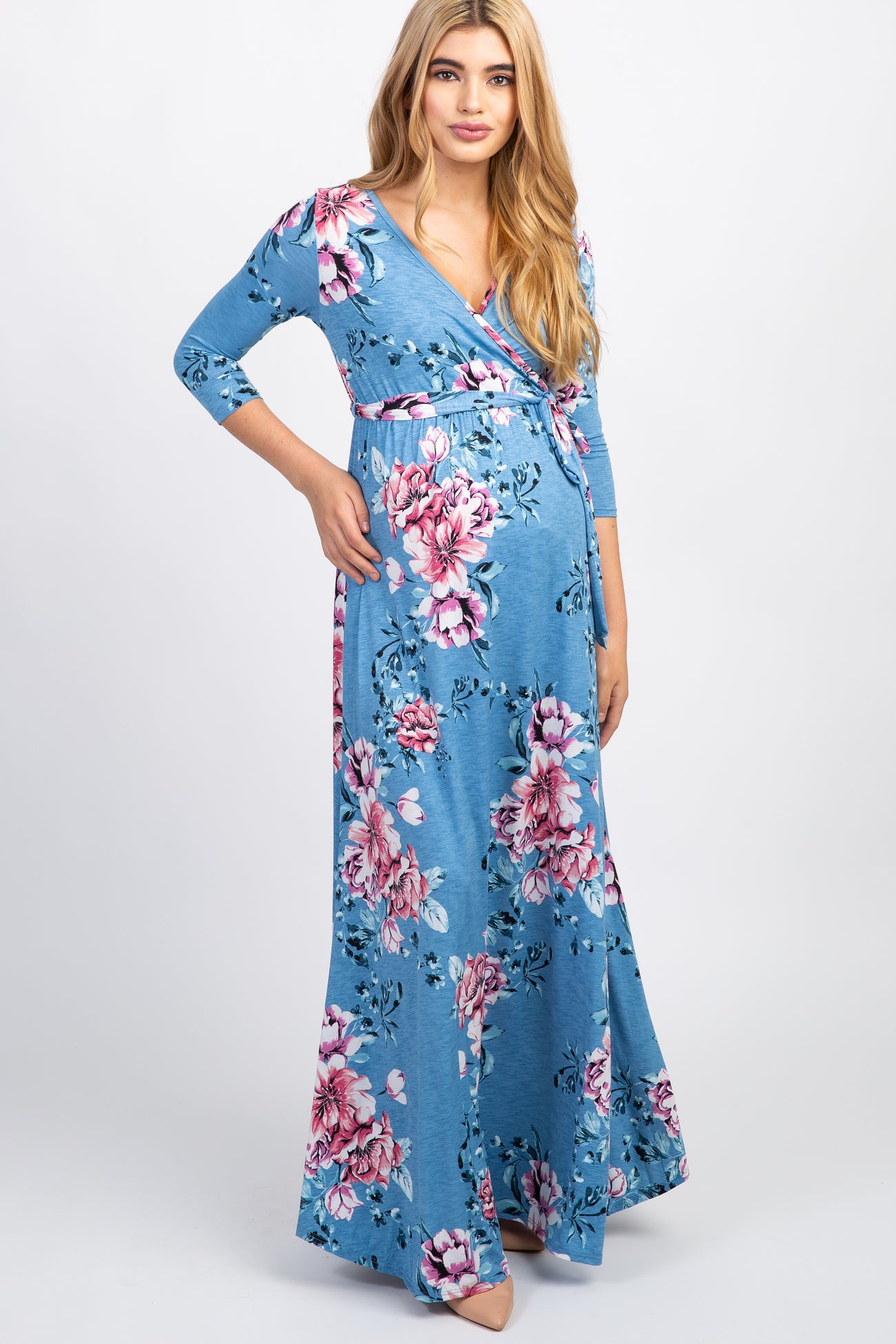 PinkBlush Blue Floral Sash Tie Maternity/Nursing Wrap Maxi Dress