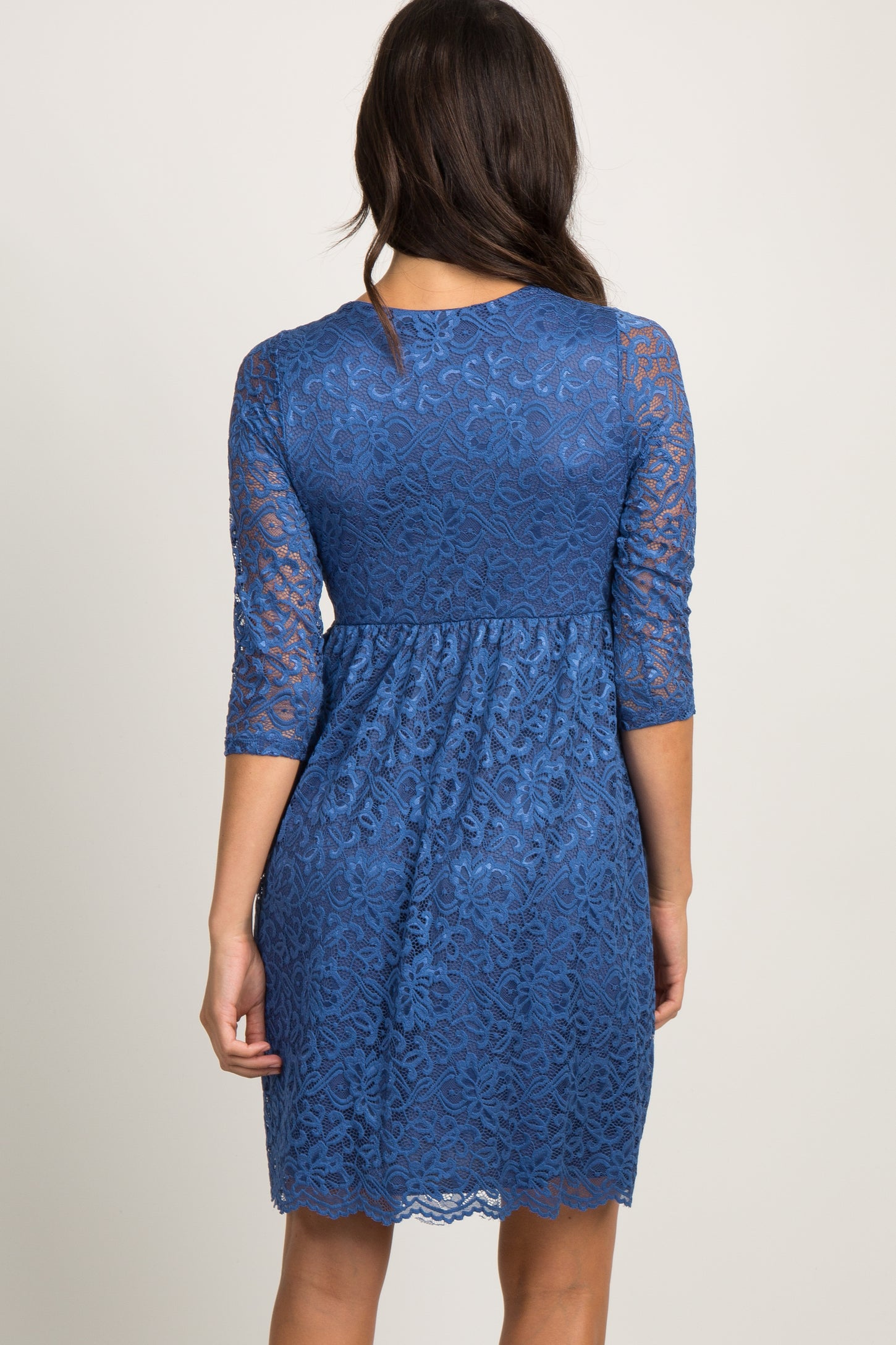 A lace overlay dress featuring semi-sheer 3/4 sleeves, double lining to prevent sheerness, a scalloped lace trim, elastic cinching under the bust, and a wrap v-neckline.