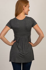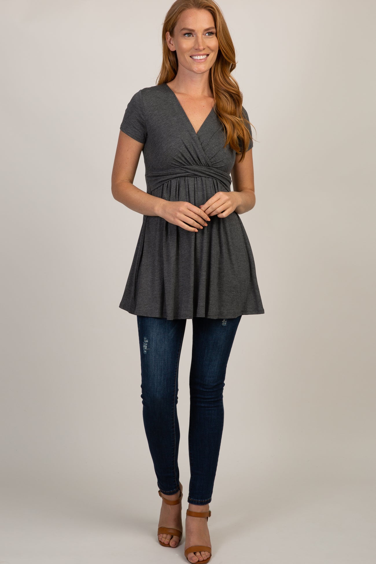 A draped front top featuring a v-neckline, short sleeves, and cinching under bust.