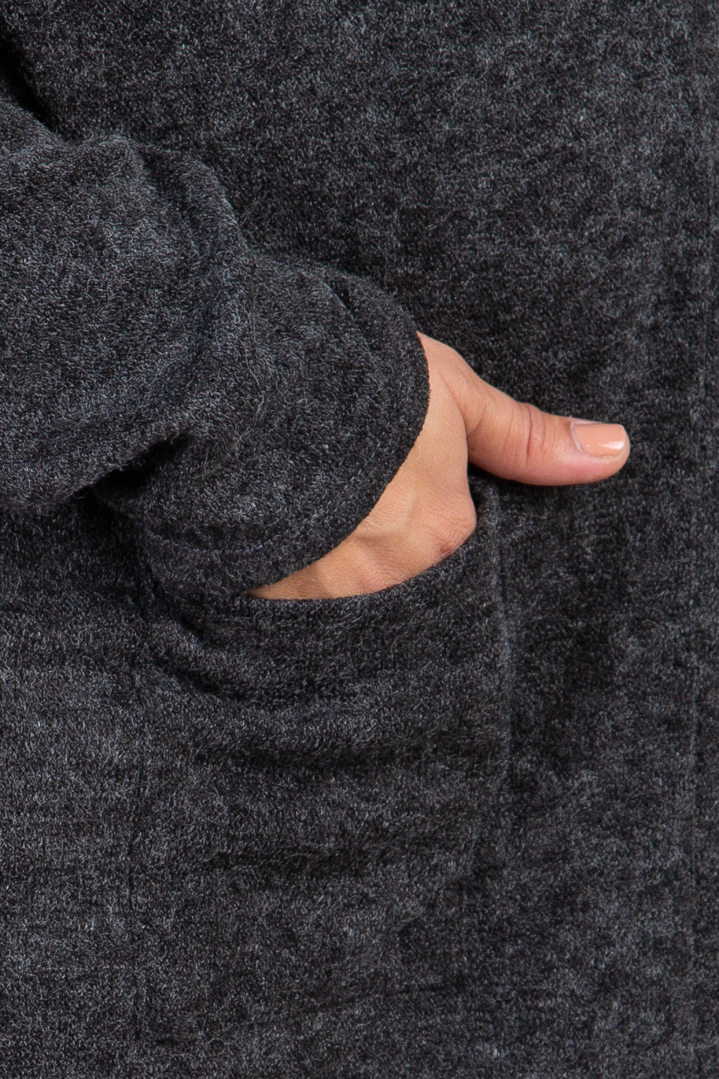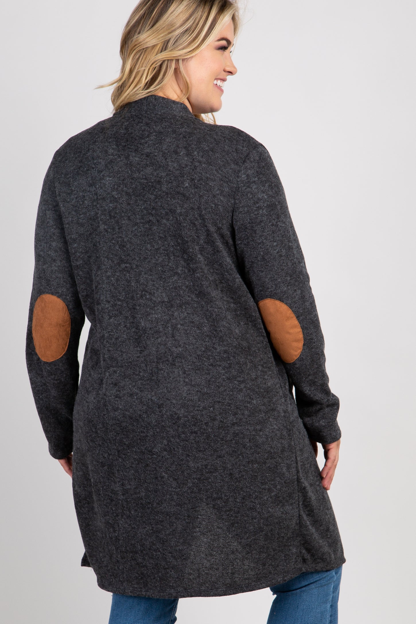 Details A solid maternity plus size cardigan. Elbow patch detail. Open front. Knit material. Content + Care