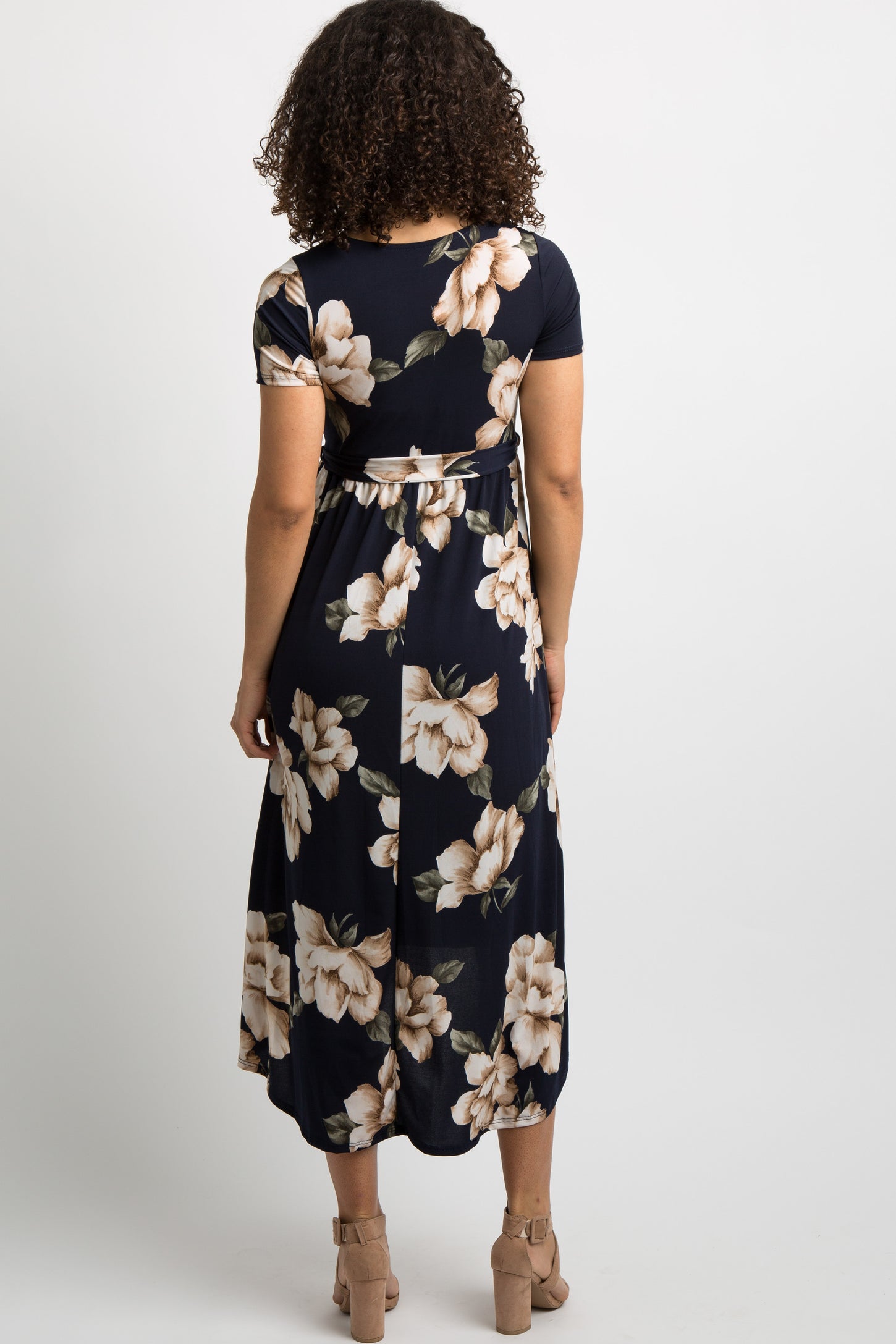 A floral, short sleeve maternity midi dress featuring a wrap v-neckline, elastic cinching under the bust, a hi-low hemline, and a sash tie. Dress is double lined to prevent sheerness.