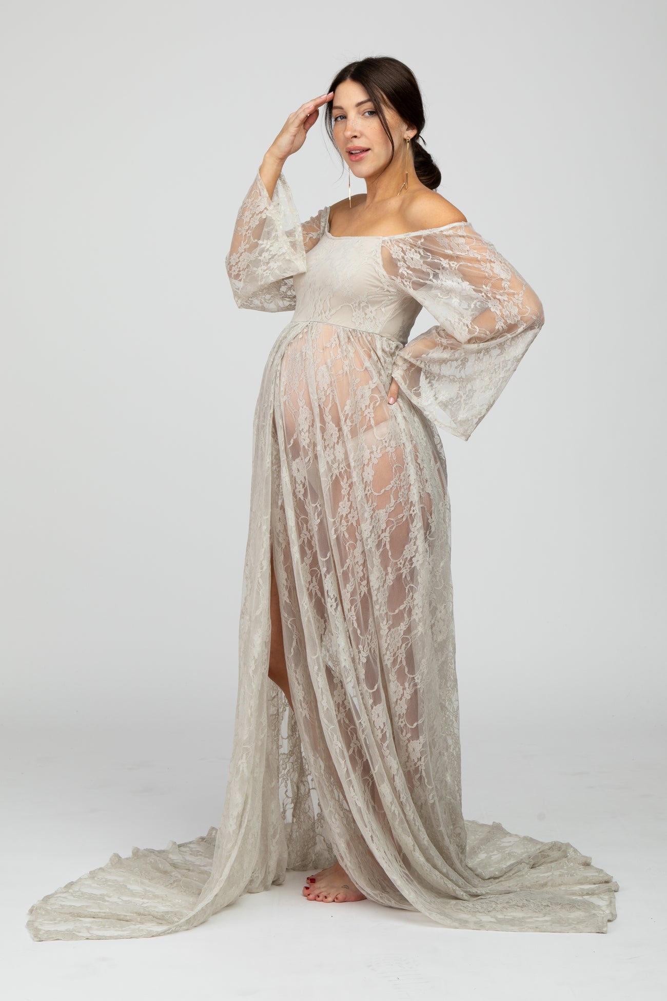 An off shoulder lace maternity gown with long bell sleeves, elastic cinching under bust and neckline, double lining on bust, and an open skirt.