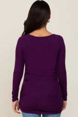 A soft brushed knit maternity top with long ruched sleeves, a rounded neckline, and ruched sides.