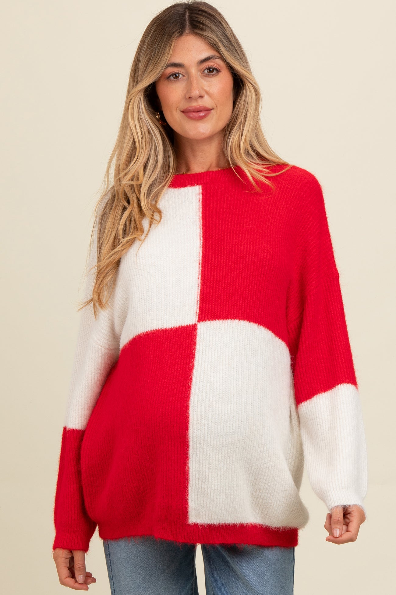 Red Colorblock Checker Print Fuzzy Knit Maternity Sweater
