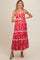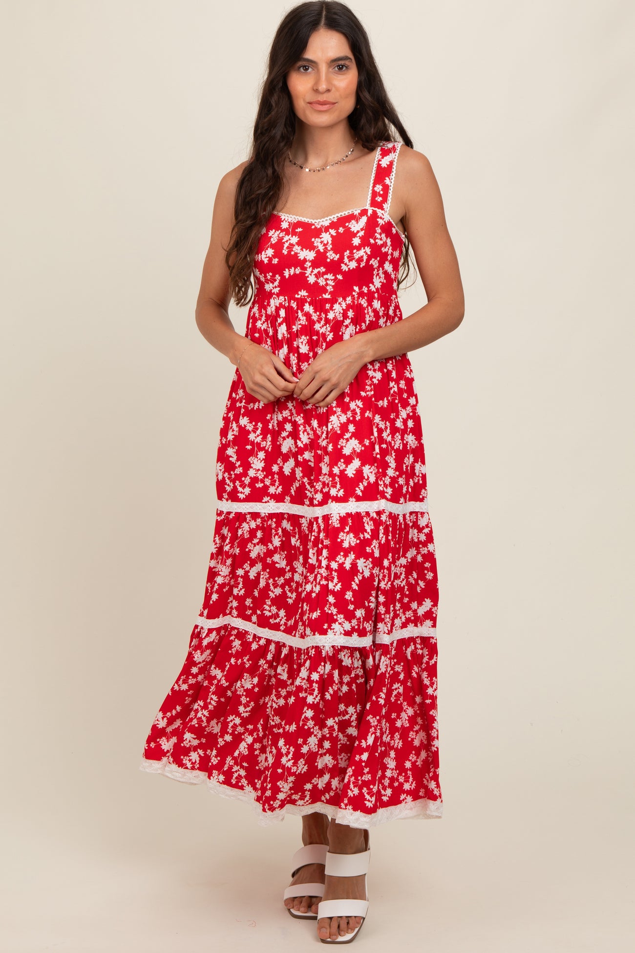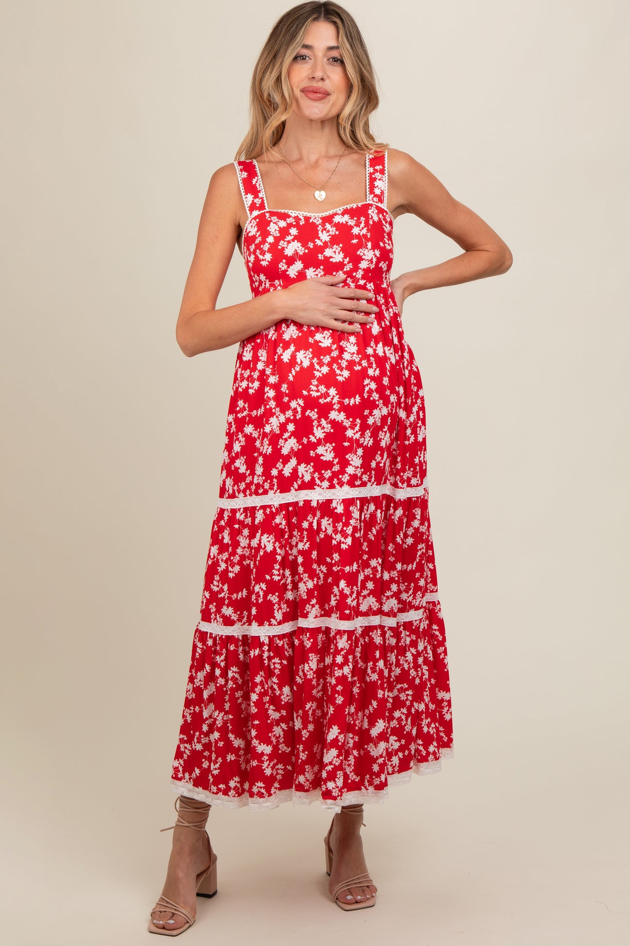 Red Floral Lace Trim Tiered Maternity Maxi Dress