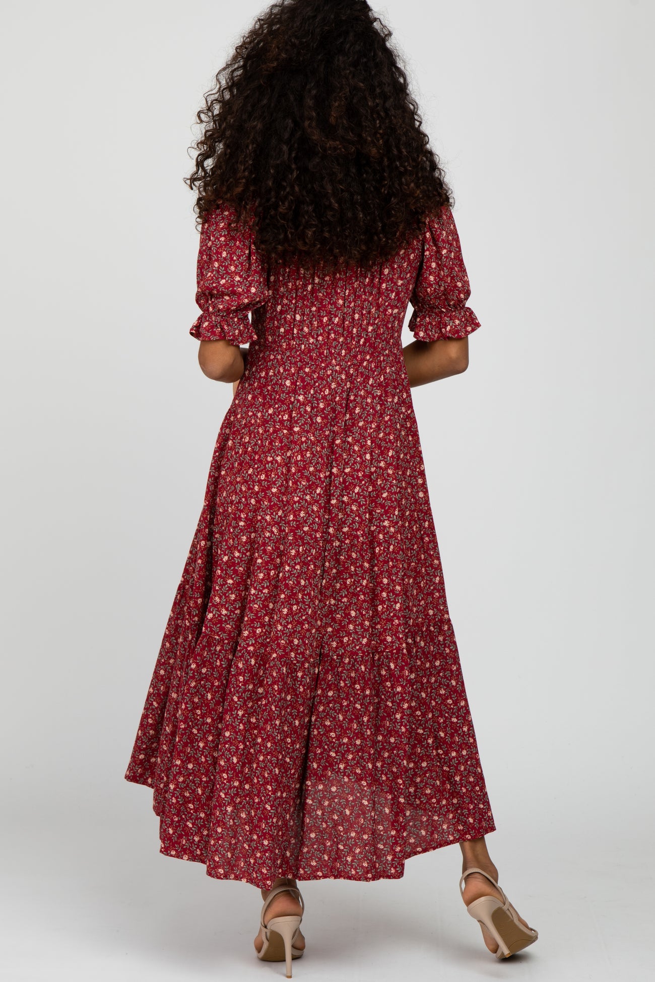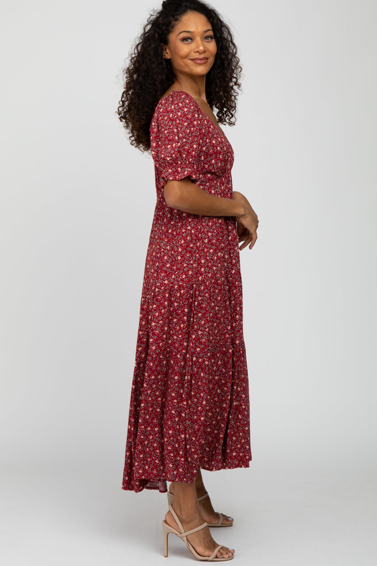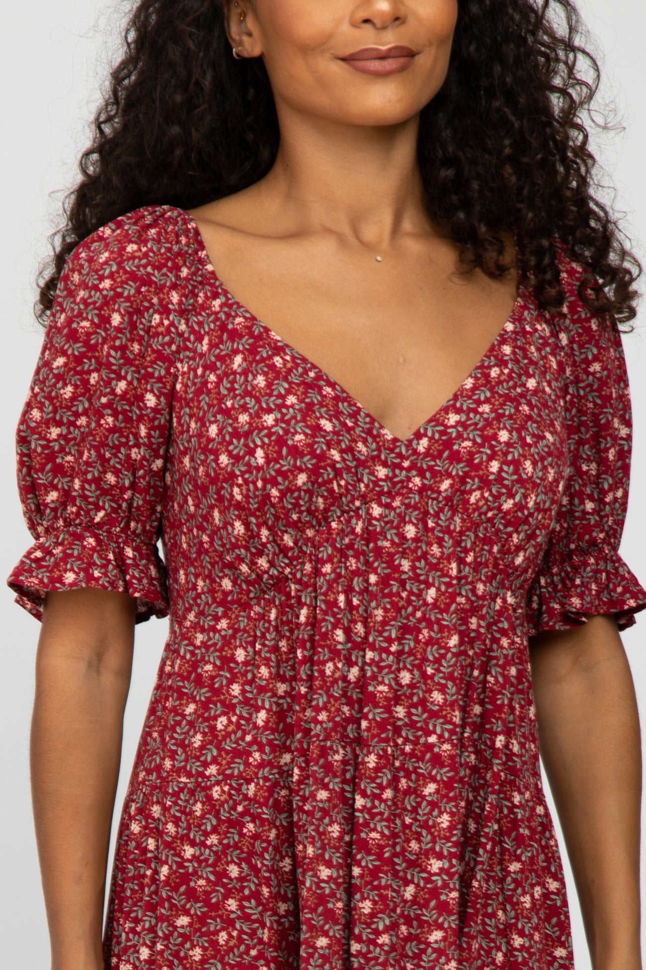 A floral print midi dress featuring a v-neckline, short bubble sleeves with ruffle trim, an empire waist with an elastic band, pleated tiers and a ruffle hem.