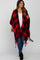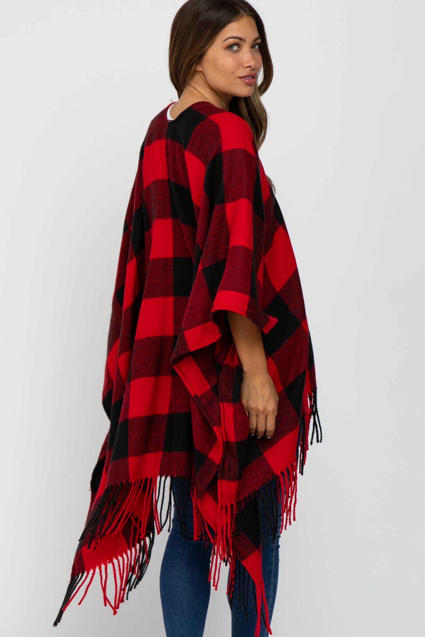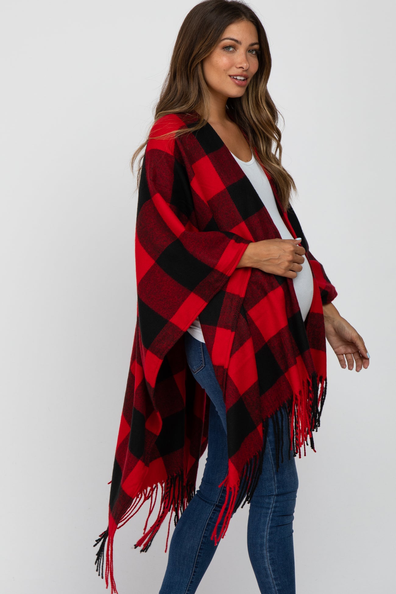 A soft knit maternity shawl poncho featuring short sleeves, side slits, and a fringe hem.