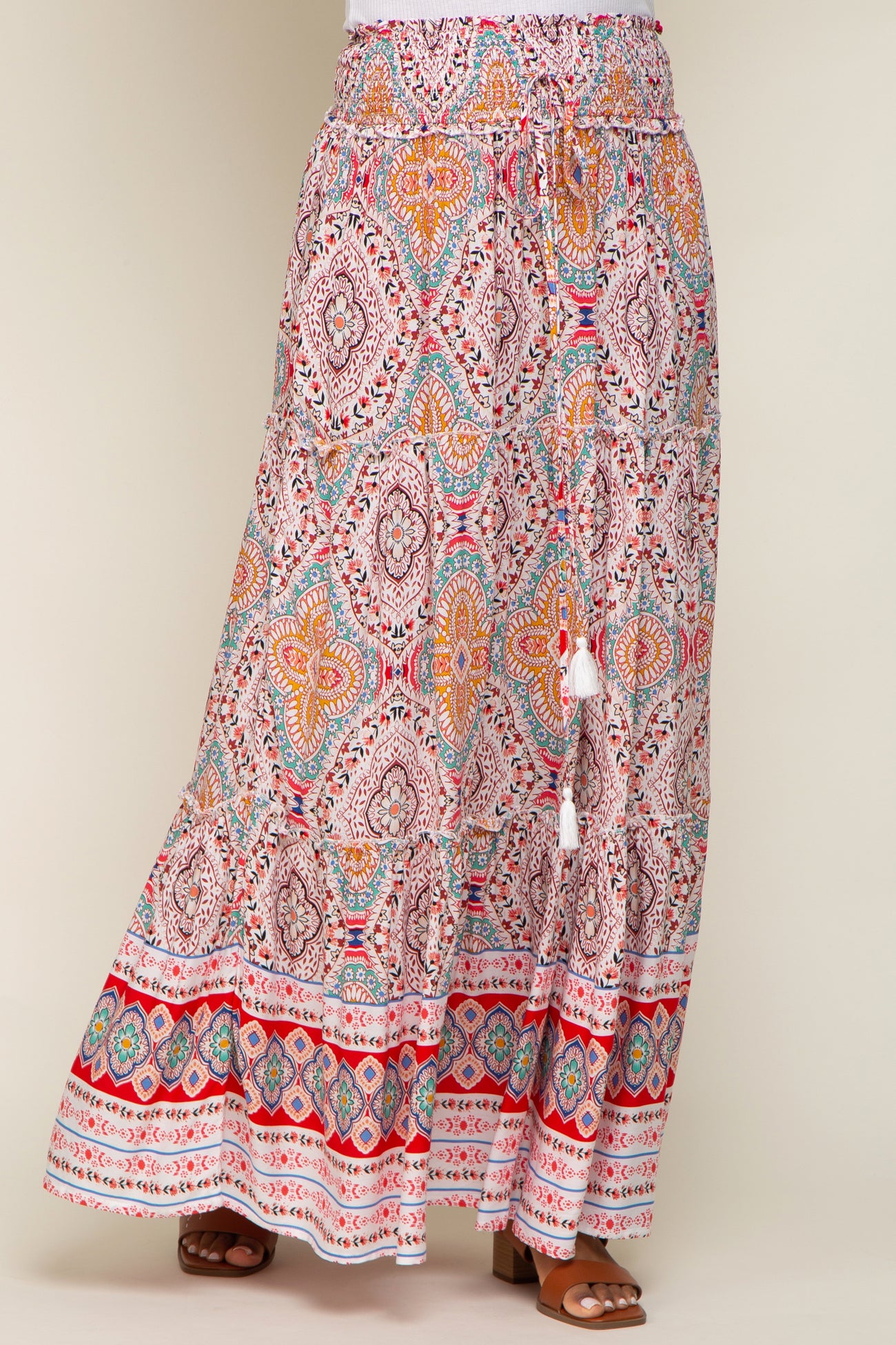 Details A printed maxi skirt with a smocked elastic waistband. Content + Care