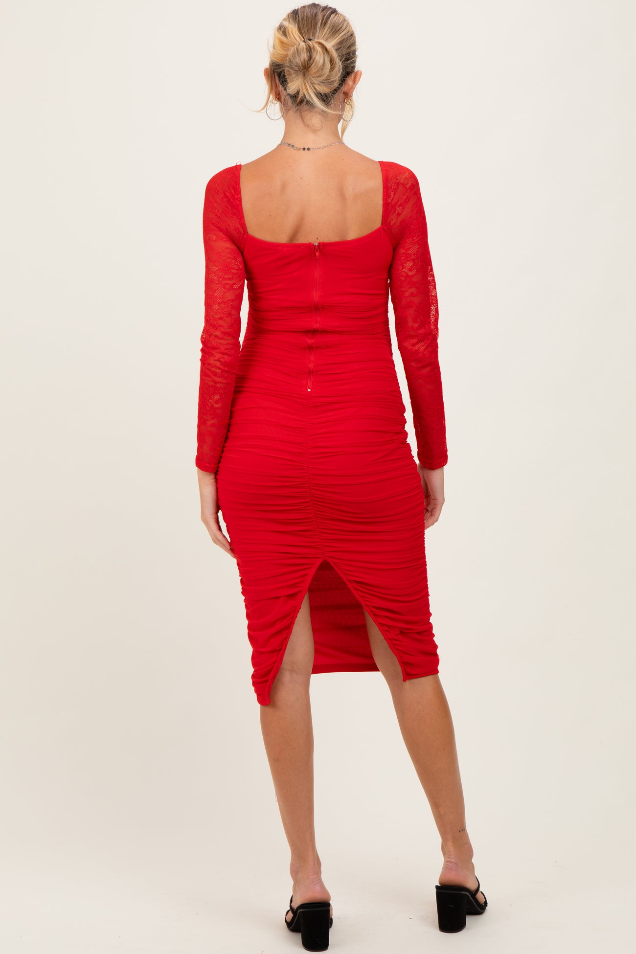 Red Ruched Lace Sleeve Maternity Midi Dress