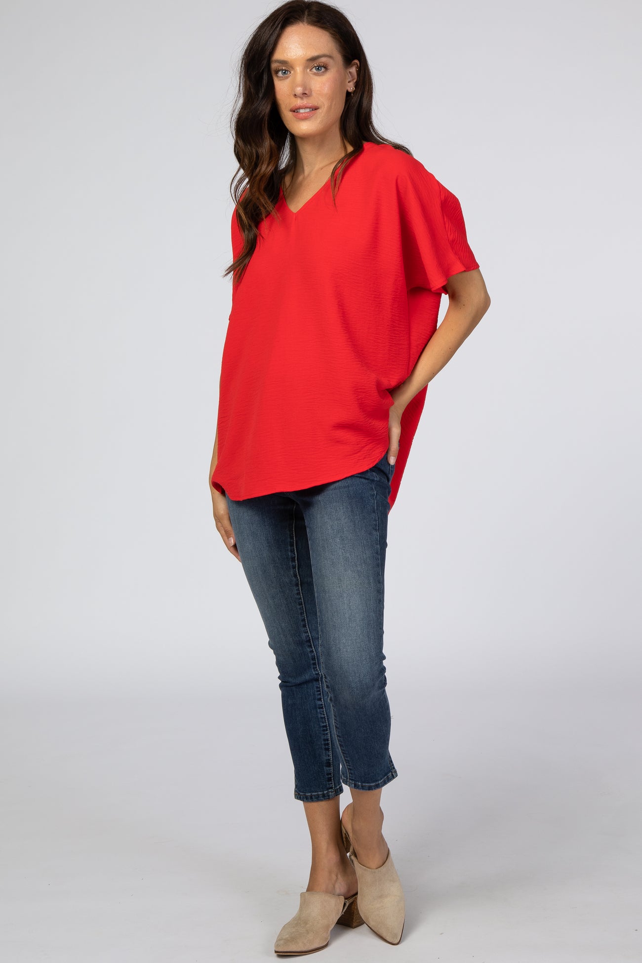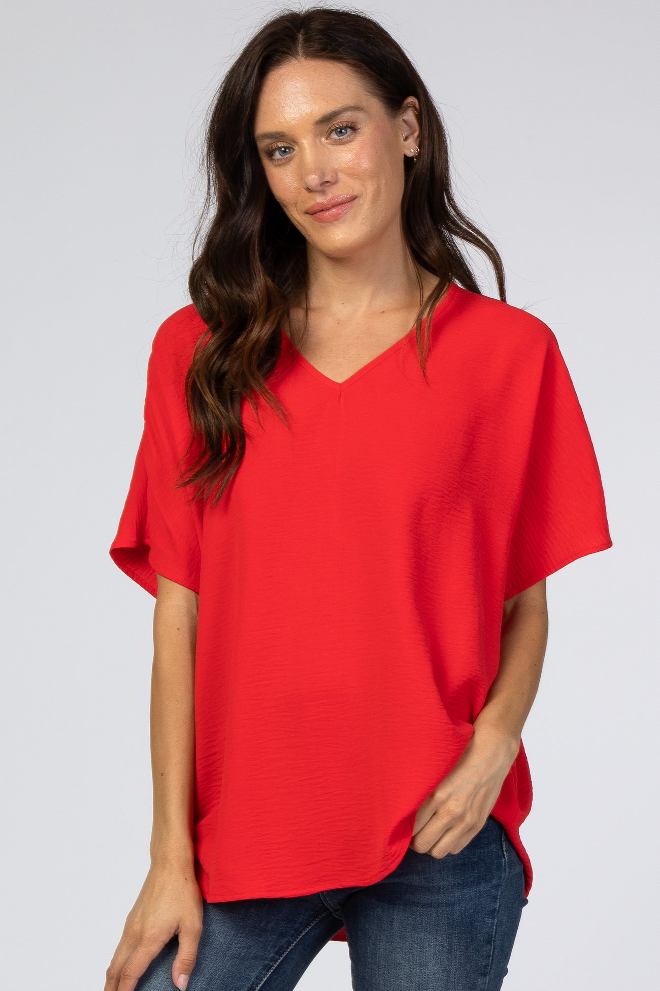A solid hued blouse featuring short sleeves and a v-neckline.