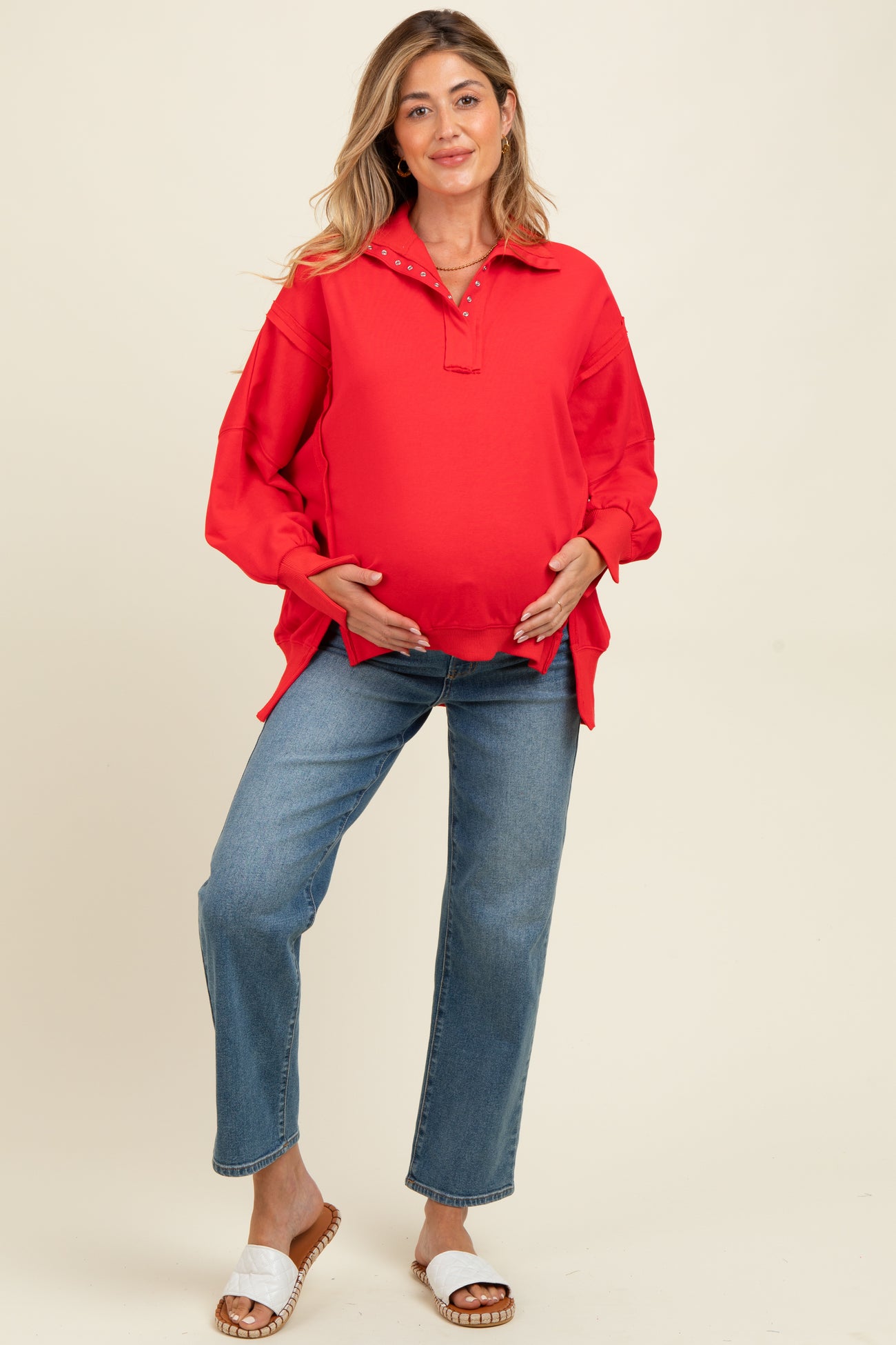 Red Snap Button Pullover Henley Maternity Sweatshirt