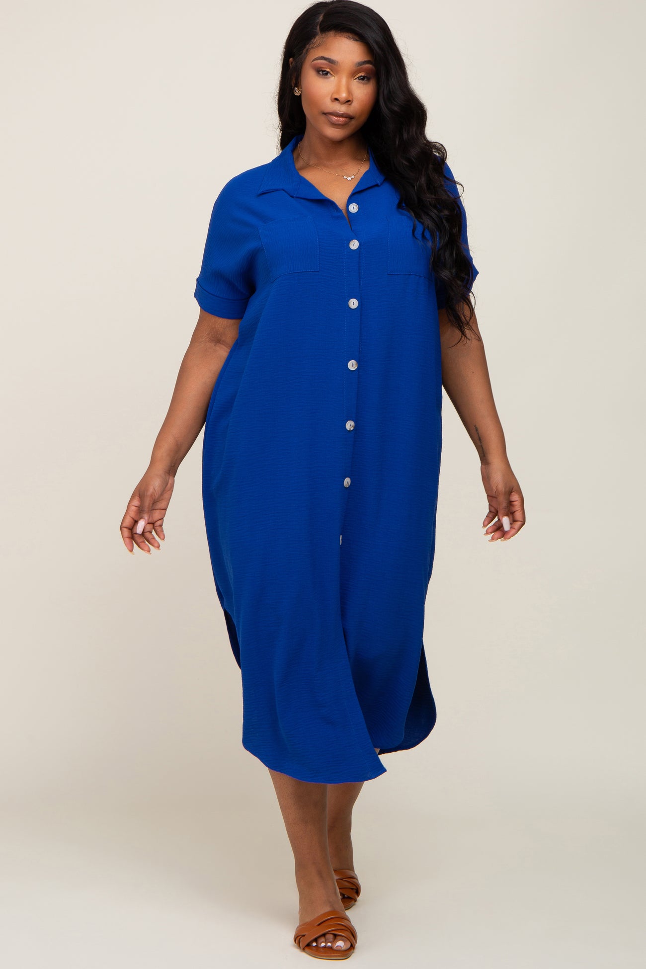 Royal Blue Button Down Hi Low Plus Maxi Dress