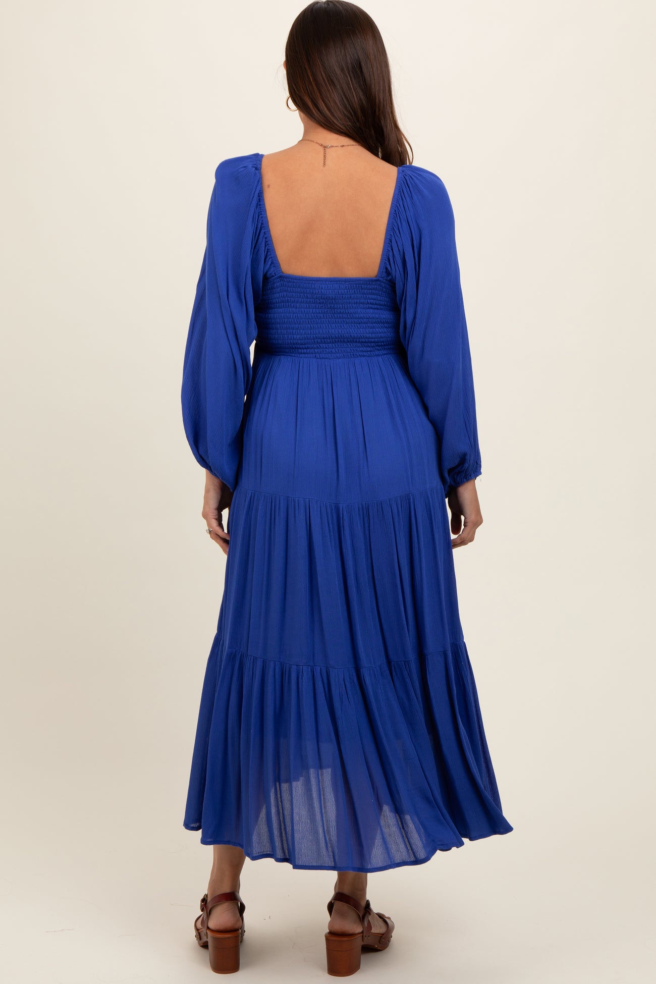 A solid maternity midi dress with a square neckline, smocking in back, oversized sleeves and tiered skirt. Dress is double lined.