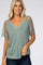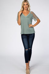 Details A solid hued top featuring short lace sleeves, a v-neckline., and lace along the neckline Content + Care