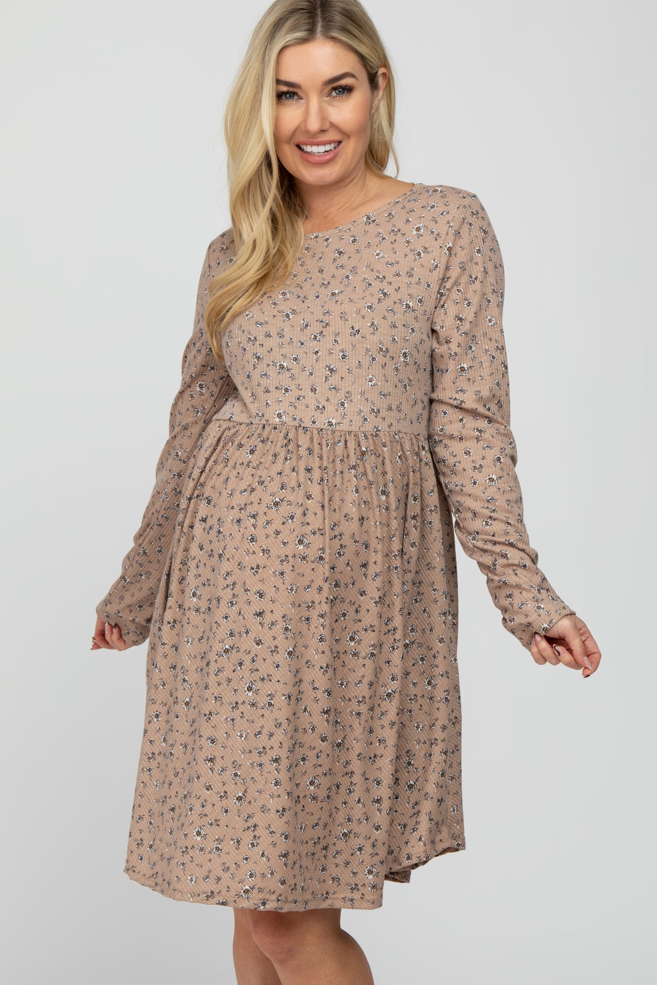 Taupe Floral Ribbed Long Sleeve Maternity Dress