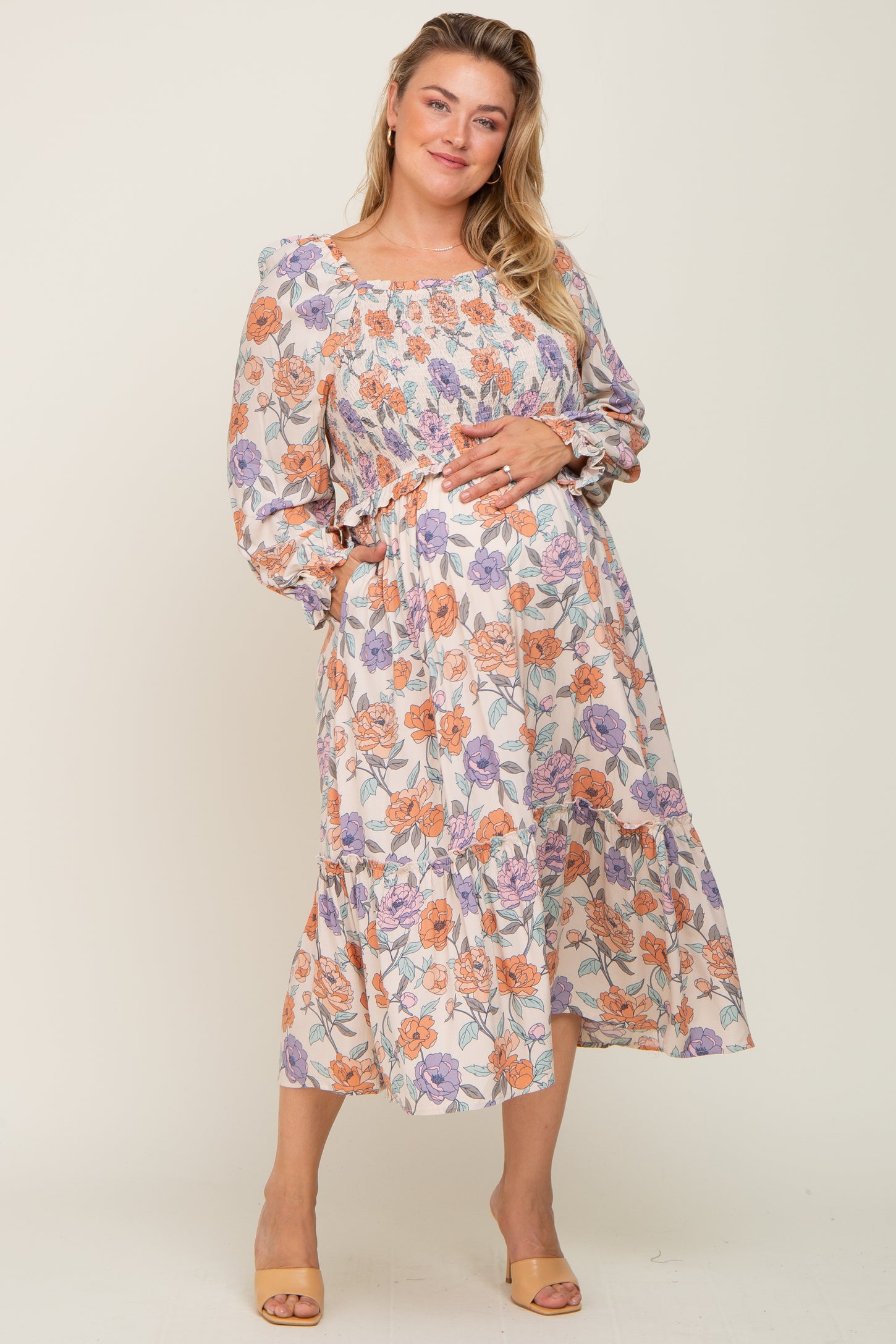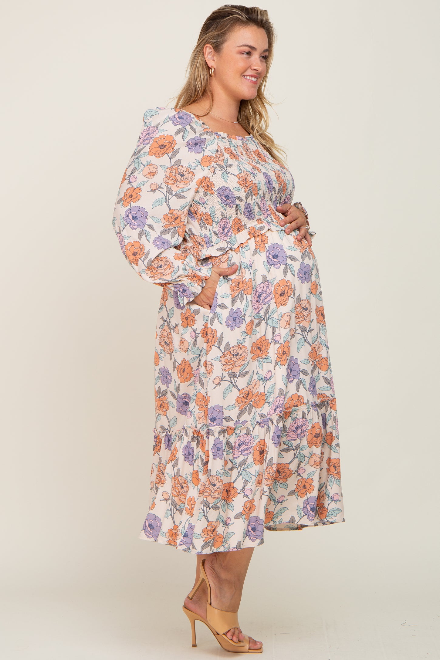 A multi-color floral plus maternity midi dress featuring long sleeves, a smocked top, ruffle accents, a ruffle hem and side pockets.