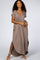 A solid hued dress featuring short sleeves, a round neckline, side pockets, a curved hem and large side slits.