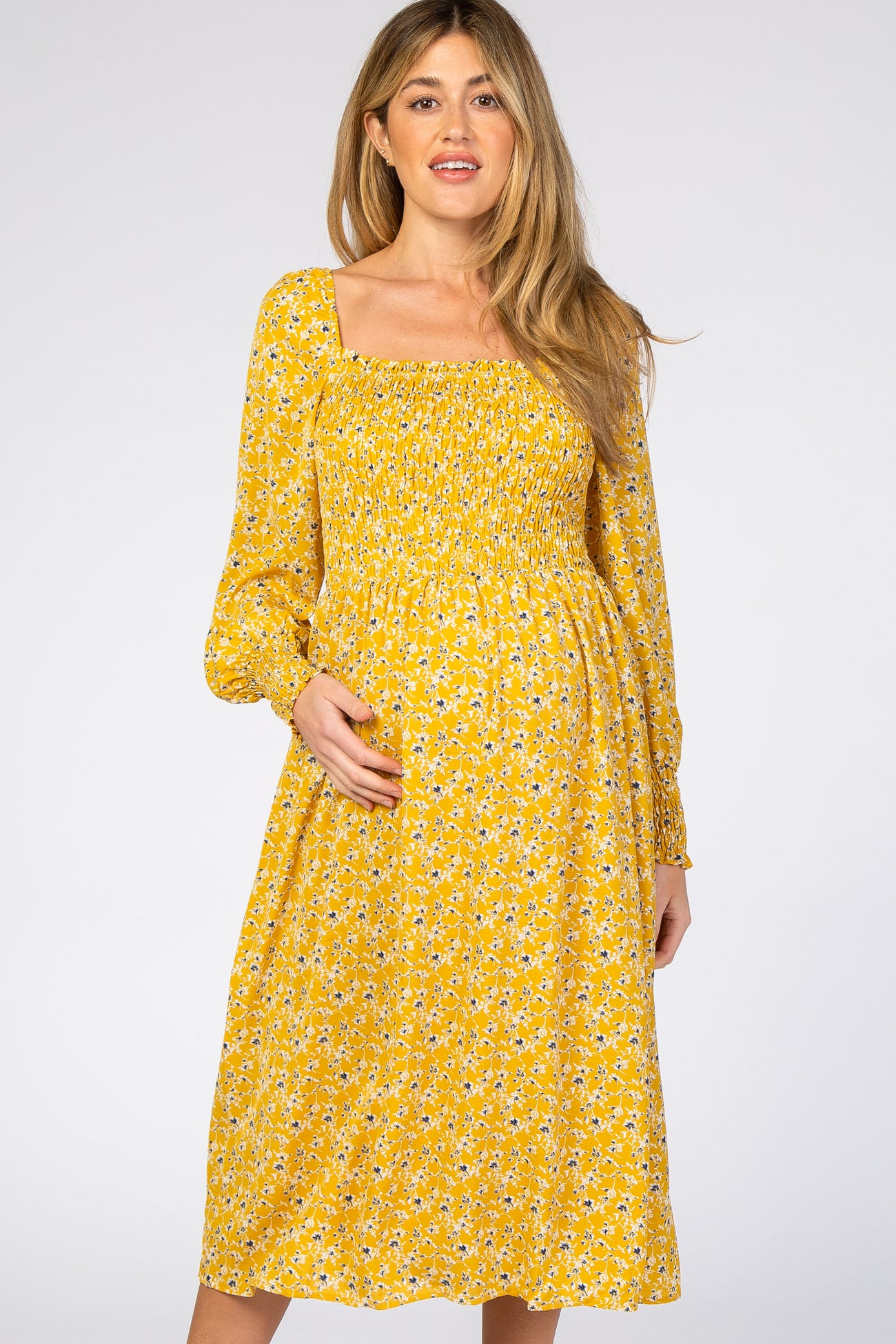 Yellow Floral Smocked Bubble Sleeve Maternity Midi Dress